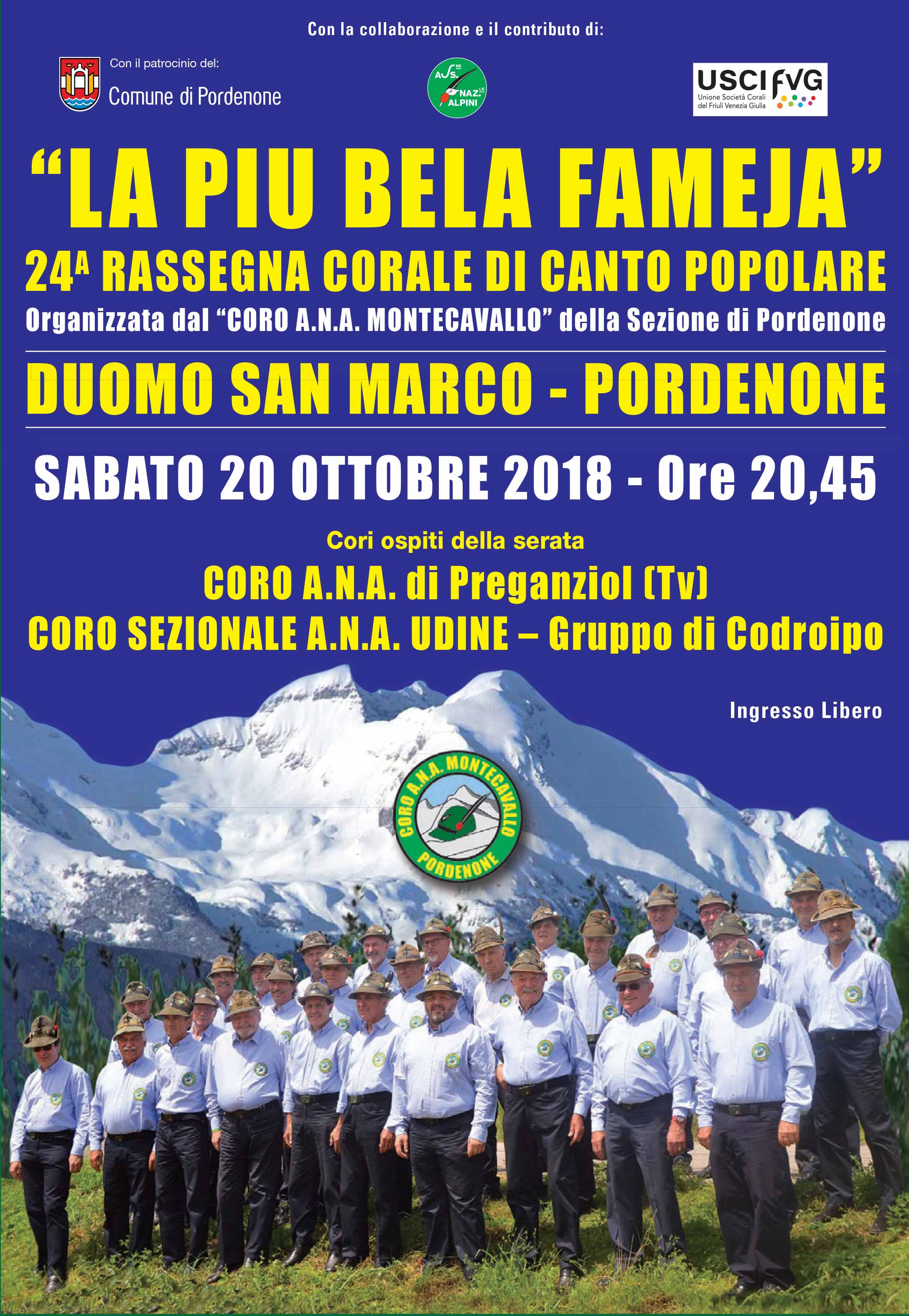 24^ RASSEGNA CORALE DI CANTO POPOLARE "LA PIU' BELA FAMEJA" Sab 20 ottobre 2018 - ore 20,45 Duomo S.Marco - Pordenone Si esibiranno i Cori: Coro A.N.A. di Preganziol (TV) Coro A.N.A. di Codroipo (UD)