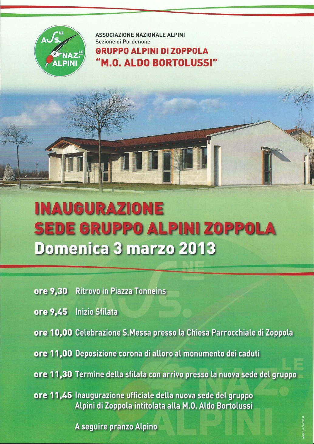 ore 11,45 - Inaugurazione ufficiale della nuova sede del Gruppo Alpini di Zoppola intitolata alla M.O. Aldo Bortolussi