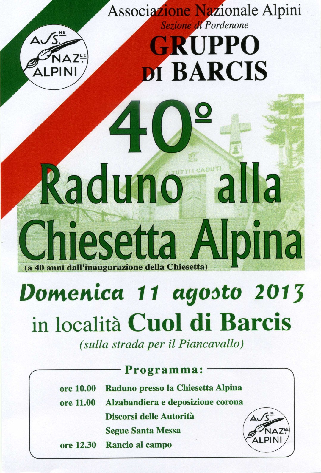 PROGRAMMA:-INSERITO LE FOTO- Domenica 11 AGOSTO Ore 10.00 Raduno presso la Chiesetta Alpina Ore 11.00 Alzabandiera e deposizione corona Discorsi delle Autorità Segue Santa Messa Ore 12.30 Rancio al campo