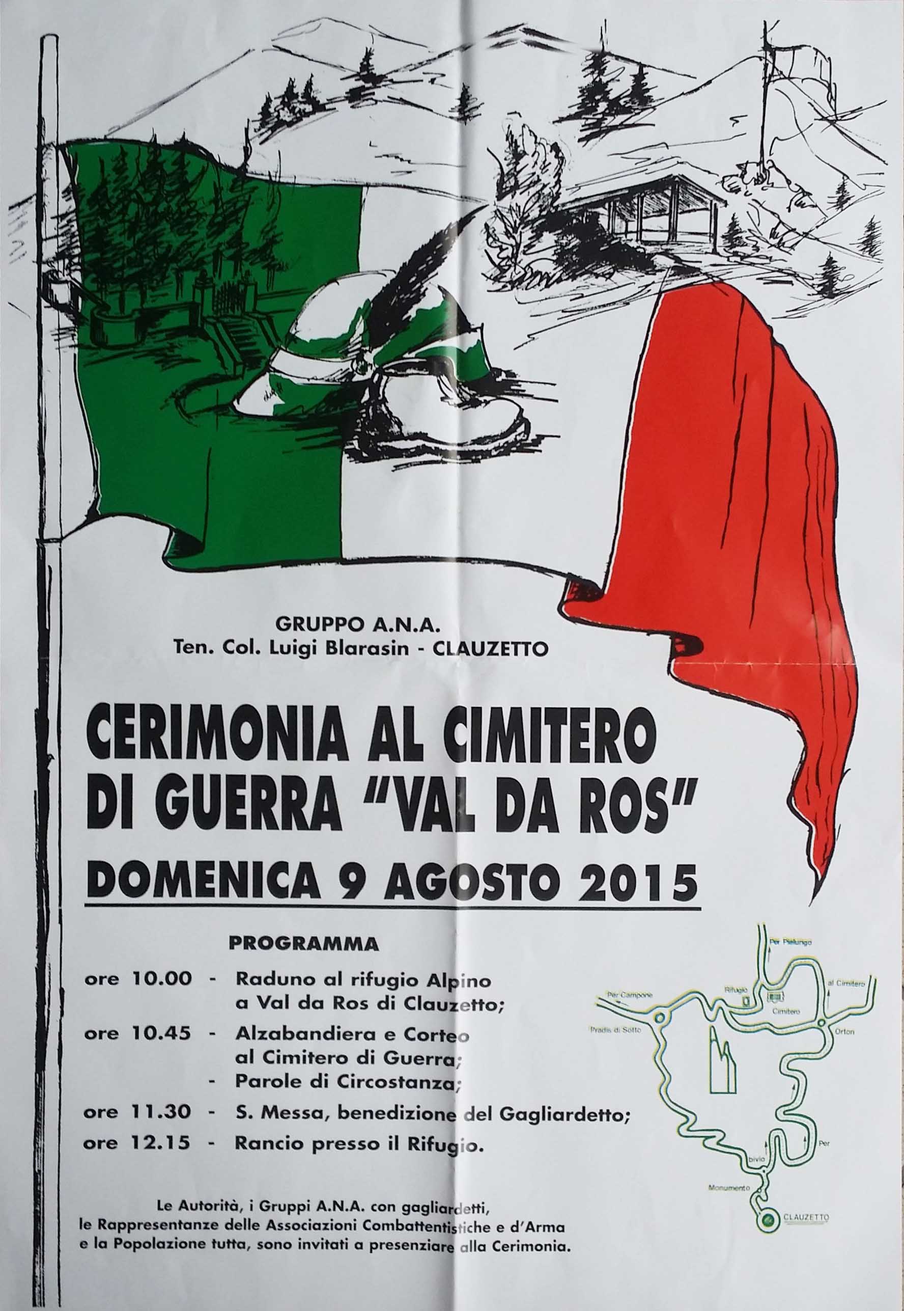 PROGRAMMA:-Aggiunto foto-Domenica 9 agosto 2015ore 10.00 Raduno al rifugio Alpino.ore 10.45 Alzabandiera e Corteo al Cimitero di Guerra -Discorsiore 11.30 S.Messa - Benedizione del Gagliardettoore 12.30 Rancio presso il Rifugio