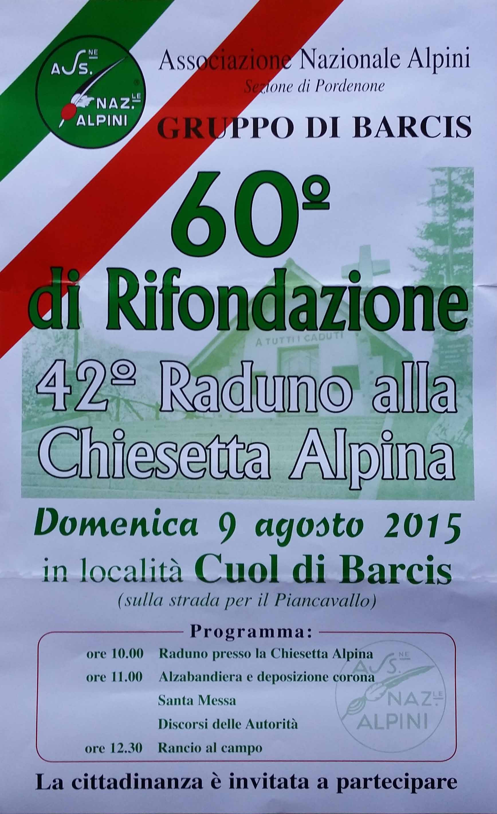 PROGRAMMA:-Inserito le foto-Dom 9 agosto 2015ore 10.00 Raduno presso la Chiesetta Alpinaore 11.00 Alzabandiera e deposizione Corona S.Messa Discorsi autoritàore 12.30 Rancio Alpino
