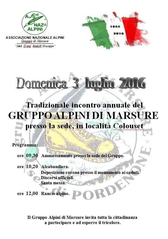 Programma:ore 09.30 Ammassamento presso la sede del Gruppoore 10.20 Alzabandiera Deposizione corona presso il Monumento ai Cadutoi Discorsi ufficiali Santa Messaore 12.00 Rancio Alpino