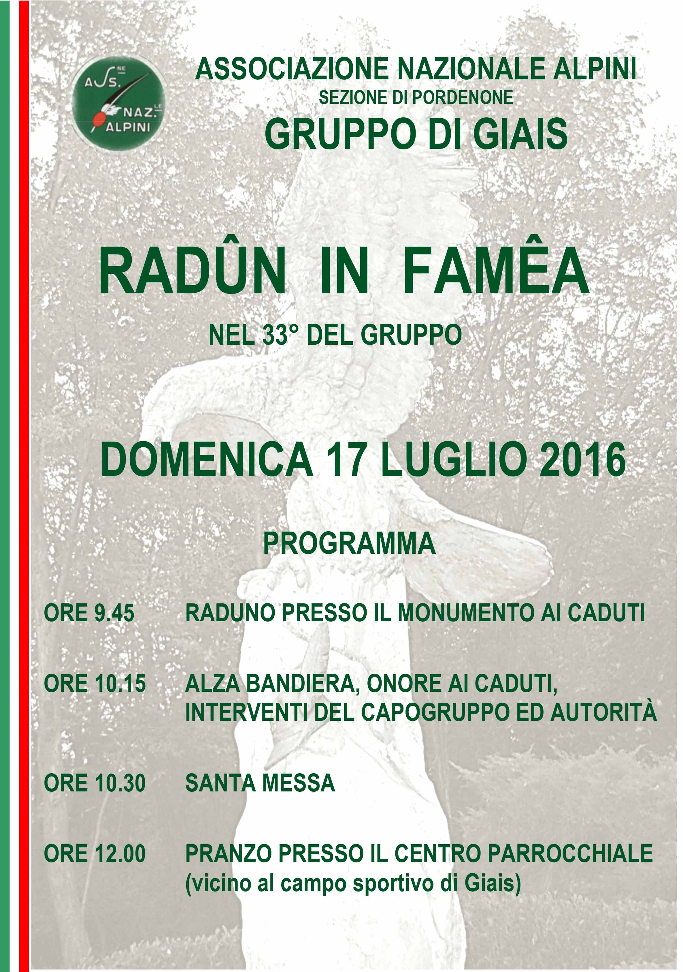 PROGRAMMA:ore 09.45 Raduno presso il Monumento ai Cadutiore 10.15 Alza Bandiera, Onore ai Caduti ore 10.30 S.Messaore 12.00 Pranzo