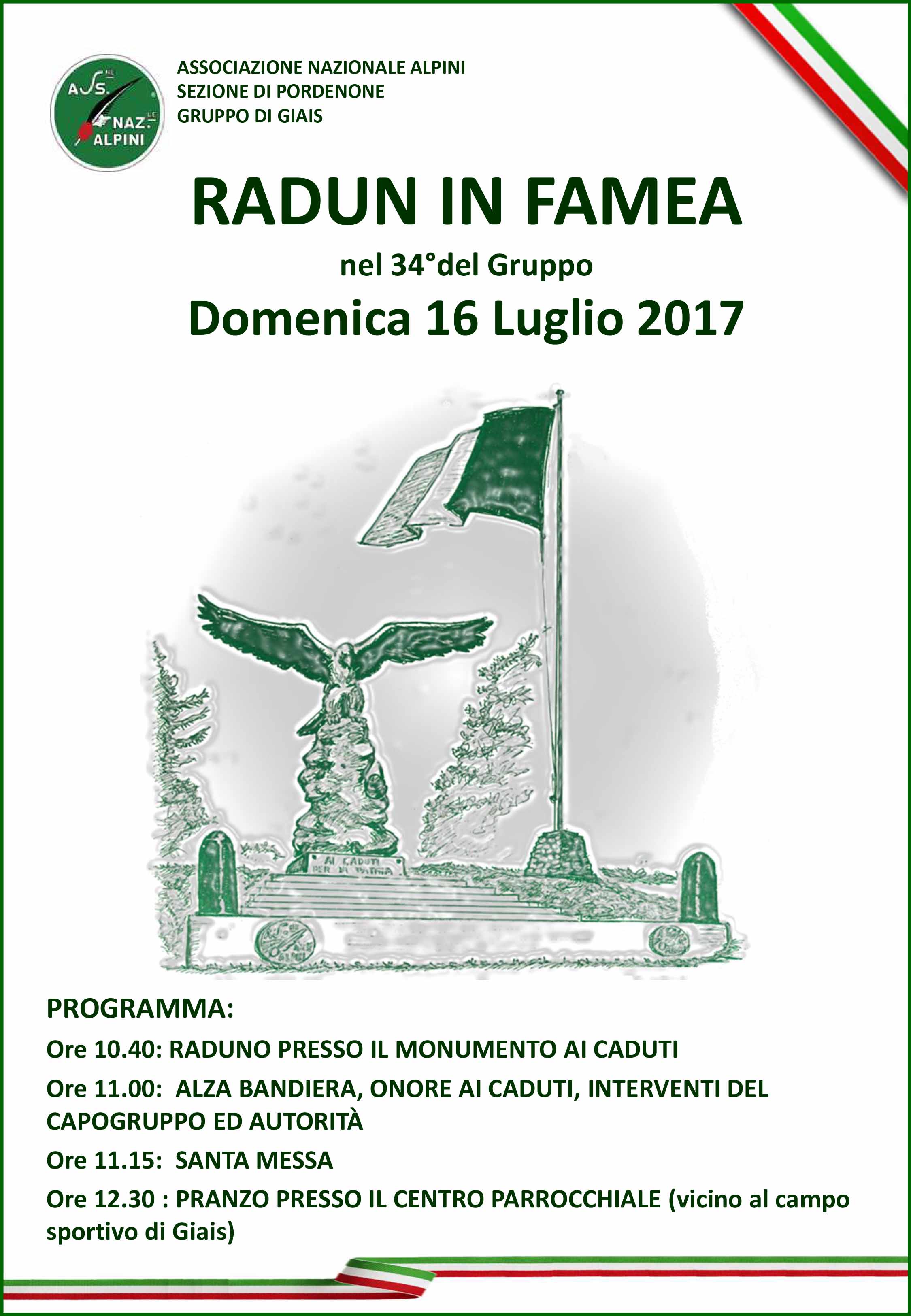PROGRAMMA:Dom 16 luglioore 10.40 RADUNO PRESSO IL MONUMENTO AI CADUTIore 11.00 ALZA BANDIERA, ONORE AI CADUTI, INTERVENTI DEL CAPOGRUPPO ED AUTORITA'ore 11.15 SANTA MESSAore 12.30 PRANZO PRESSO CENTRO COMUNITARIO