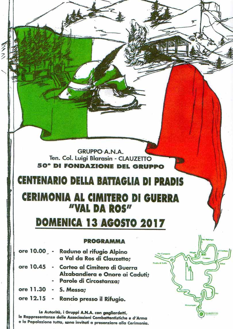 PROGRAMMAdom 13 agoore 10.00 Raduno al rifugio Alpino a Val da Ros di ClauzettO;ore 10.45 Corteo al Cimitero e Onore ai Caduti, Alzabandiera e Onore ai Caduti, Discorsi;ore 11.30 S.Messa;ore 12.15 Rancio presso il Rifugio