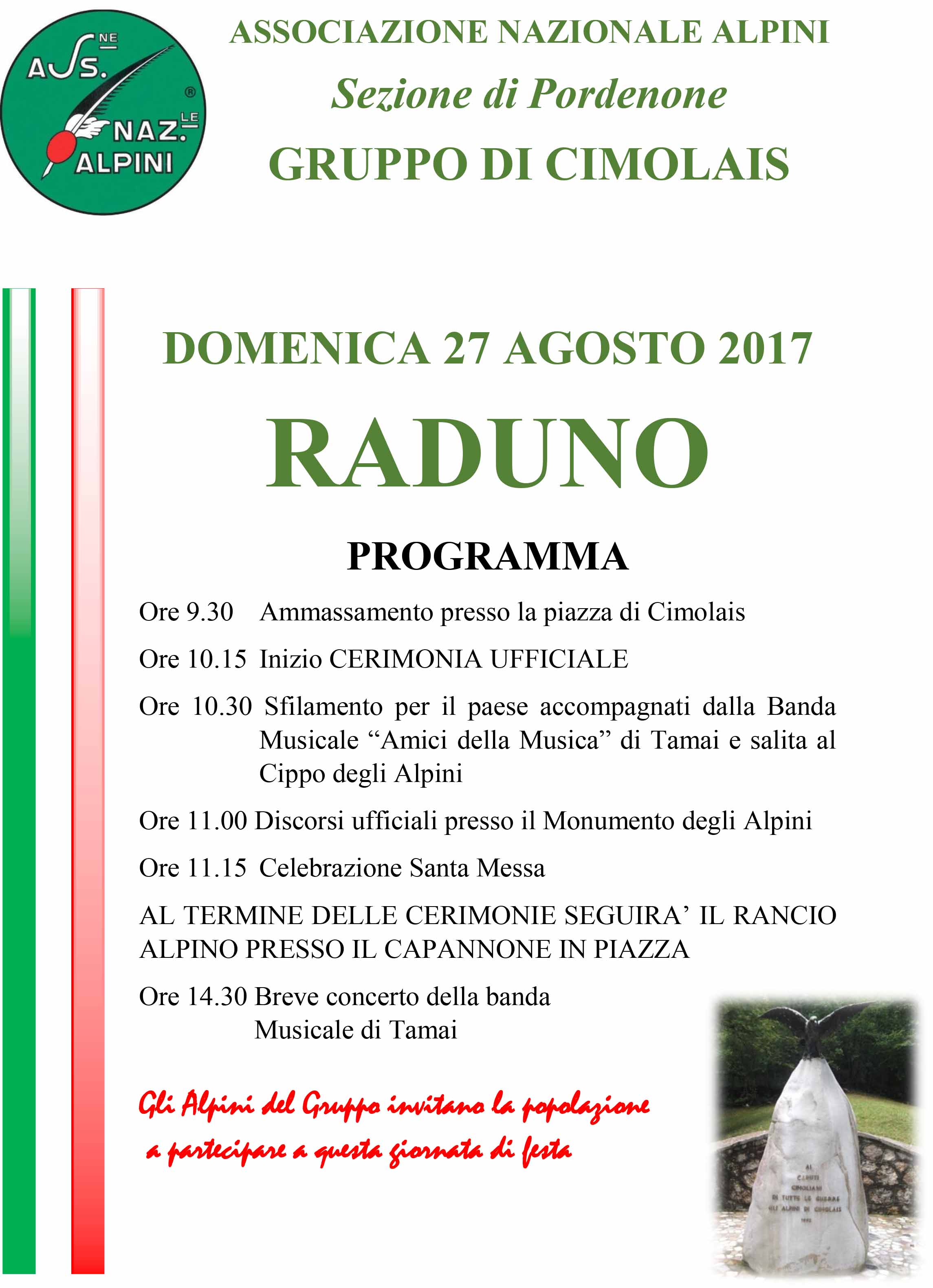 ore 10.30 Sfilamento per il paese accompagnati dalla Banda Musiacle "Amici della Musica" di Tamai e salita al Cippo degli Alpini