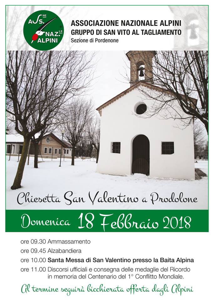 Domenica 18 febbraio 2018PROGRAMMA:ore 09.30 Ammassamentoore 09.45 Alzabandieraore 10.00 S.Messa di San Valentino presso Baita Alpinaore 11.00 Discorsi e consegna delle medaglie del Ricordo in memoria del centenario della 1^ Guerra Mondiale.