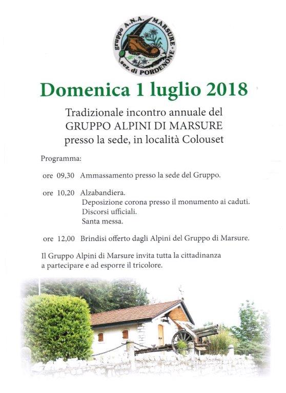PROGRAMMA:Dom 1 luglio 2018ore 09.30 Ammassamento presso la sede del Gruppoore 10.20 Alzabandiera. Deposizione corona presso il Monumento ai Caduti Discorsi ufficiali S.Messaore 12.00 Brindisi offerto dagli Alpini del Gruppo di Marsure.