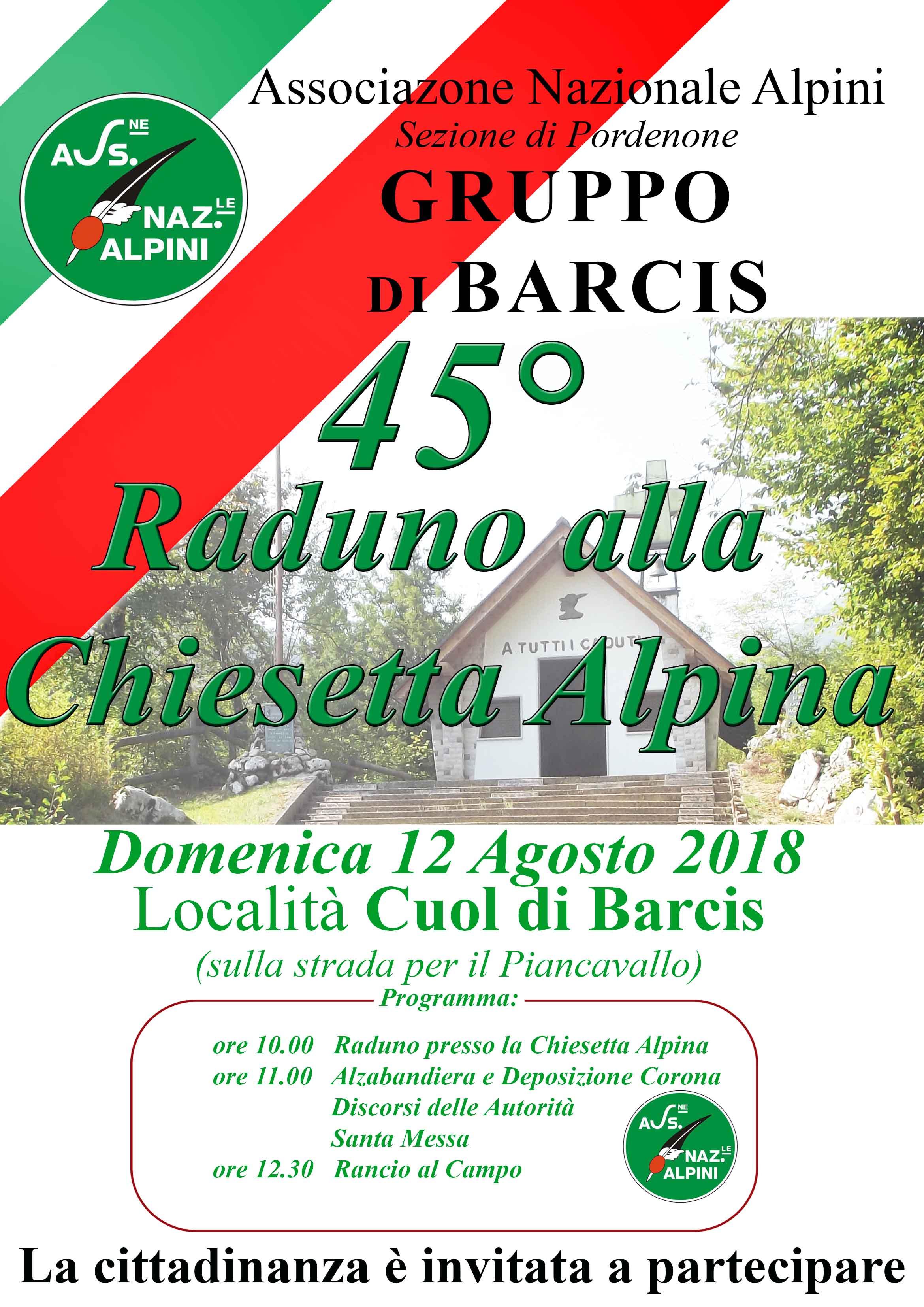 PROGRAMMA:Dom 12 agoOre 10.00 Raduno presso la Chiesetta AlpinaOre 10.30 Alzabandiera-Deposizione corona-Discorsi-S.MessaOre 12.30 Rancio al campo