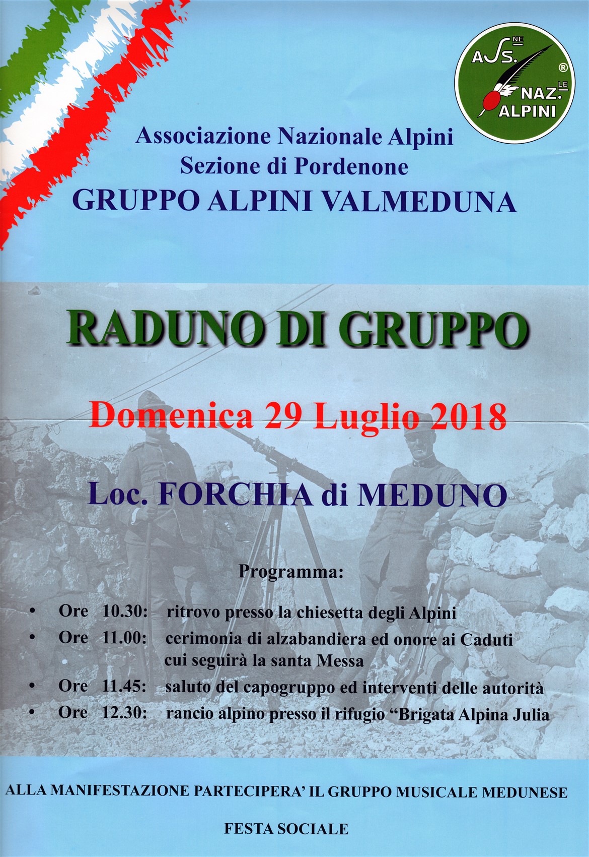 PROGRAMMA: Dom. 29 lug 2018 ore 10.30 Ritrovo presso chiesetta degli Alpini ore 11.00 Cerimonia di Alzabandiera ed Onore ai Caduti S.Messa ore 11.45 Saluto del Capogruppo ed interventi delle Autorità ore 12.30 Rancio alpino presso il rifugio "Brigata Alpina Julia"