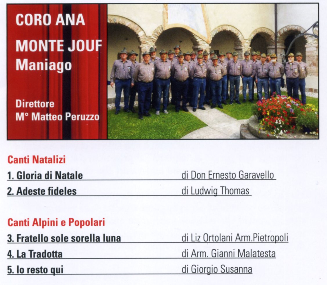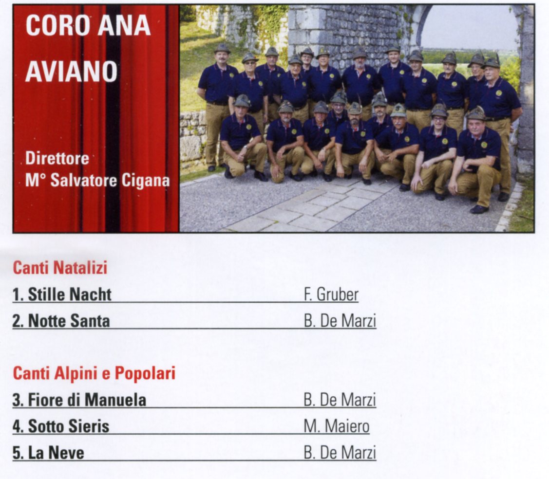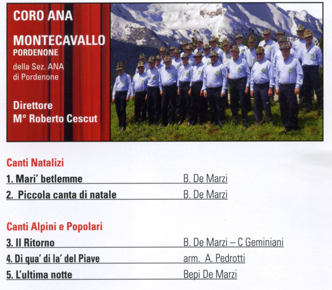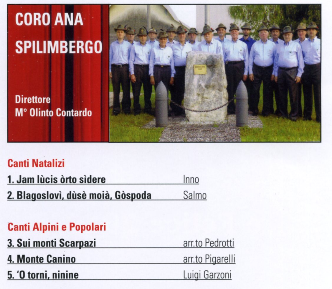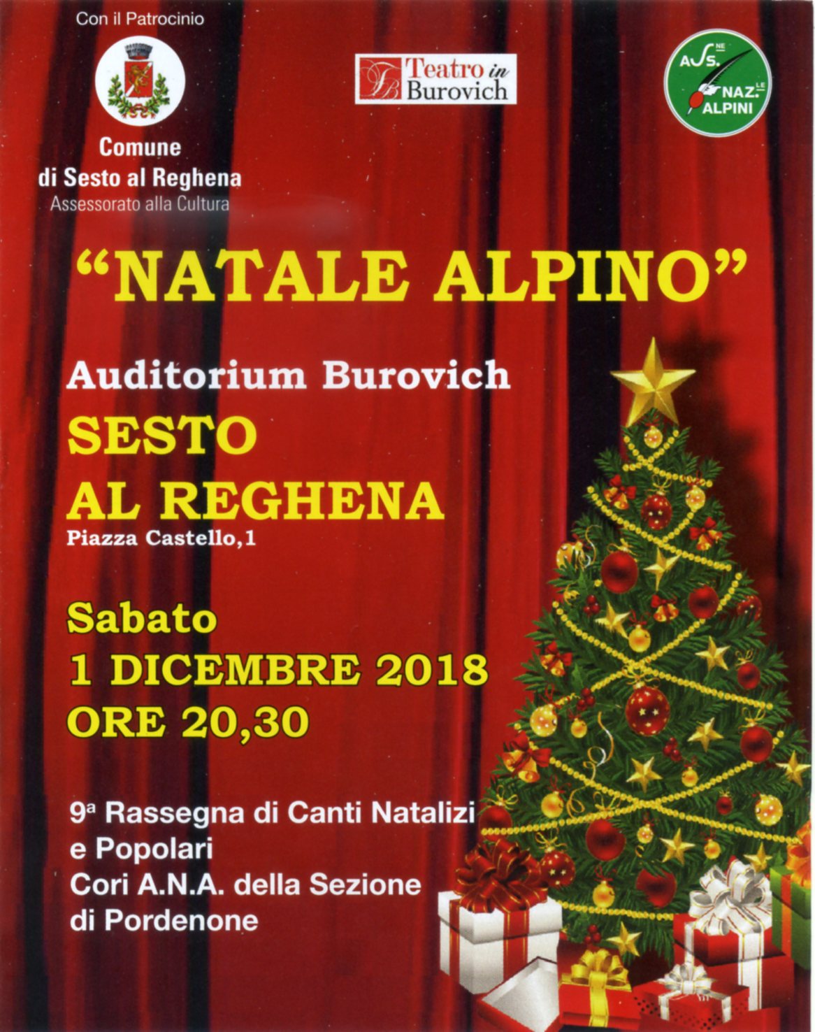 "NATALE ALPINO"9^ Rassegna di Canti Natalizi e PopolariSabato 1 dic 2018Auditorium Burovichore 20,30Parteciperanno i 4 Cori della SezioneCoro ANA AvianoCoro ANA MontecavalloCoro ANA Monte JoufCoro ANA Spilimbergo