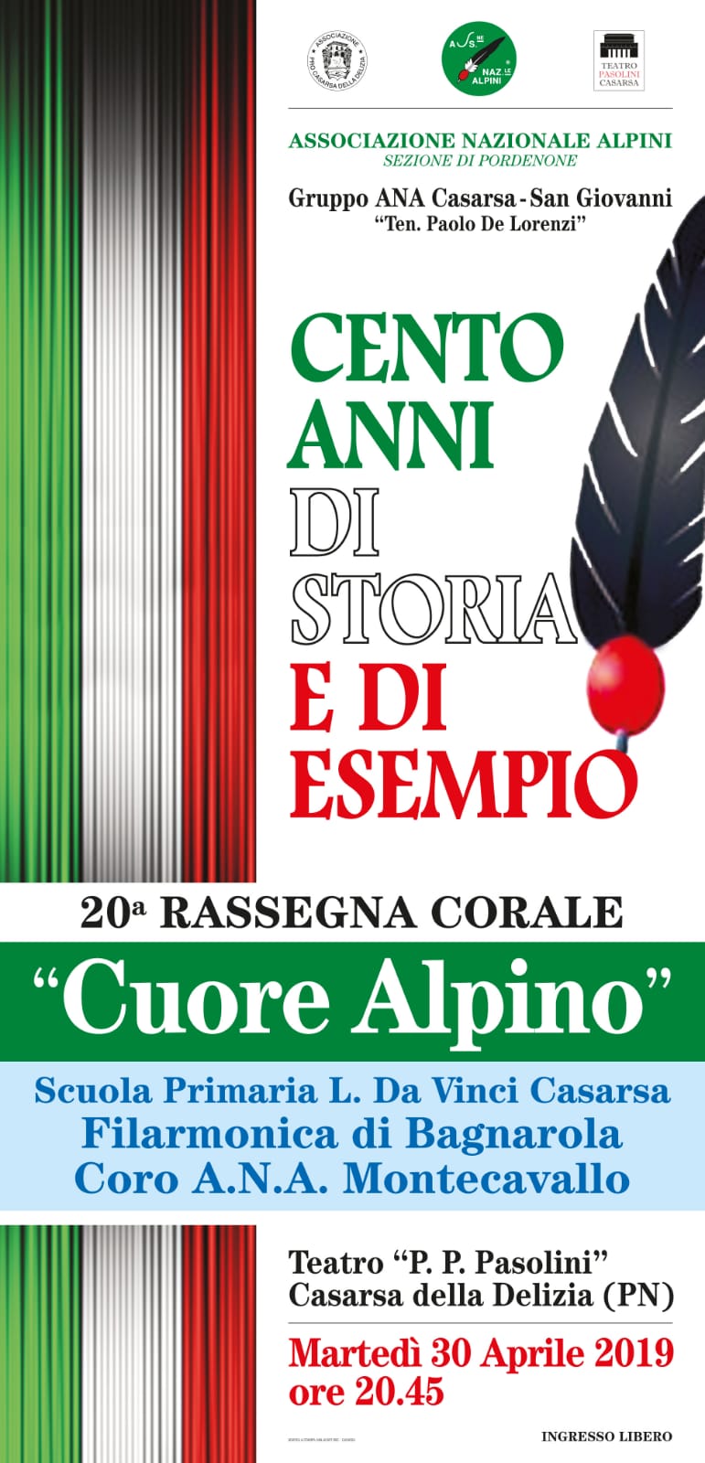 20^ Rassegna Corale "CUORE ALPINO"CENTO ANNI DI STORIA E DI ESEMPIOmar 30 apr 2019 ore 20.45-Teatro P.P.Pasolini-PROGRAMMAScuola Primaria L. da VinciFilarmonica di BagnarolaCoro A.N.A. Montecavallo
