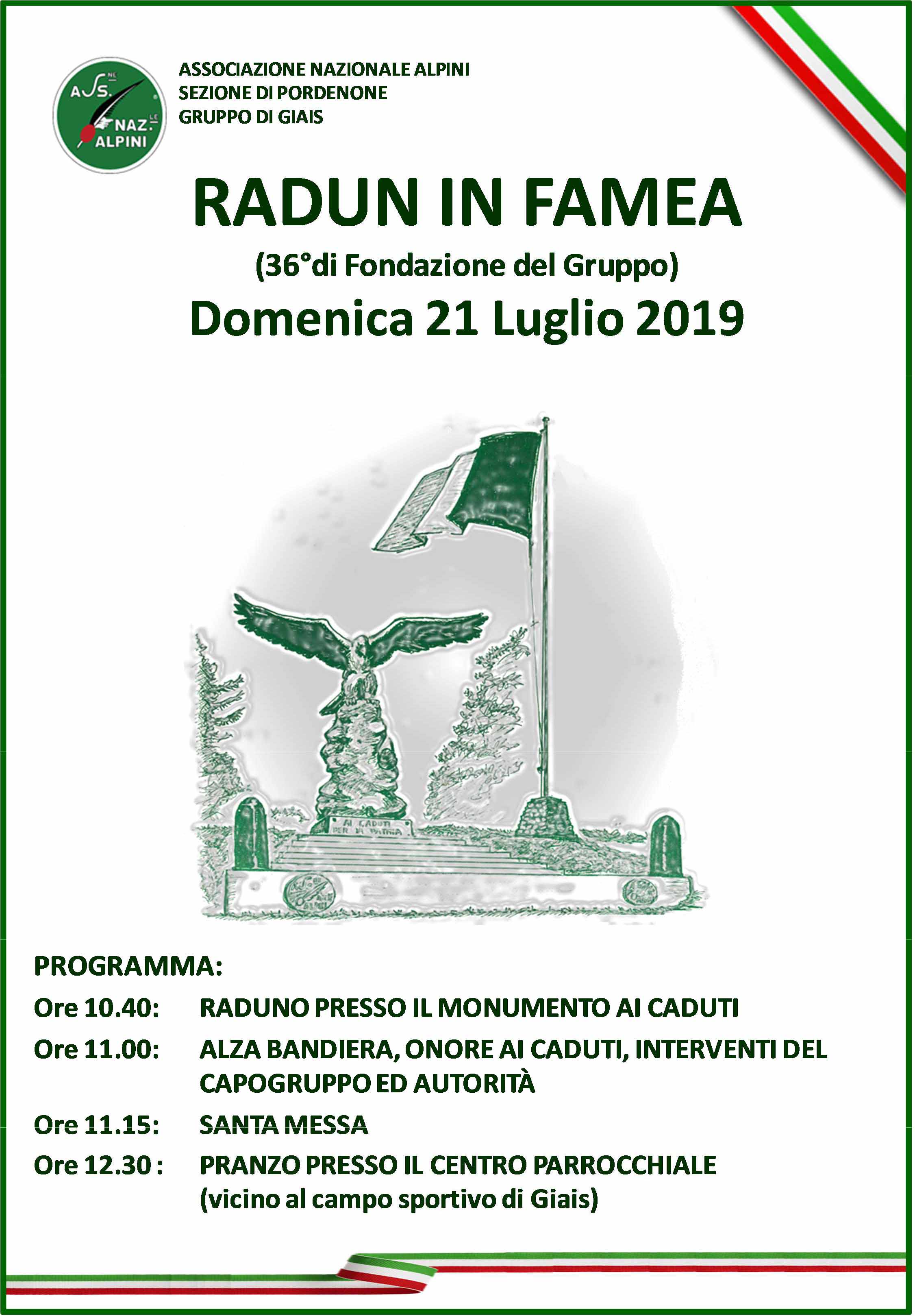 PROGRAMMADom 21 luglio 2019Ore 10.40: RADUNO PRESSO IL MONUMENTO AI CADUTIOre 11.00: ALZABANDIERA, ONORE AI CADUTI, INTERVENTI DEL CAPOGRUPPO ED AUTORITA'Ore 11.15: SANTA MESSAOre 12.30: PRANZO PRESSO IL CENTRO PARROCCHIALE