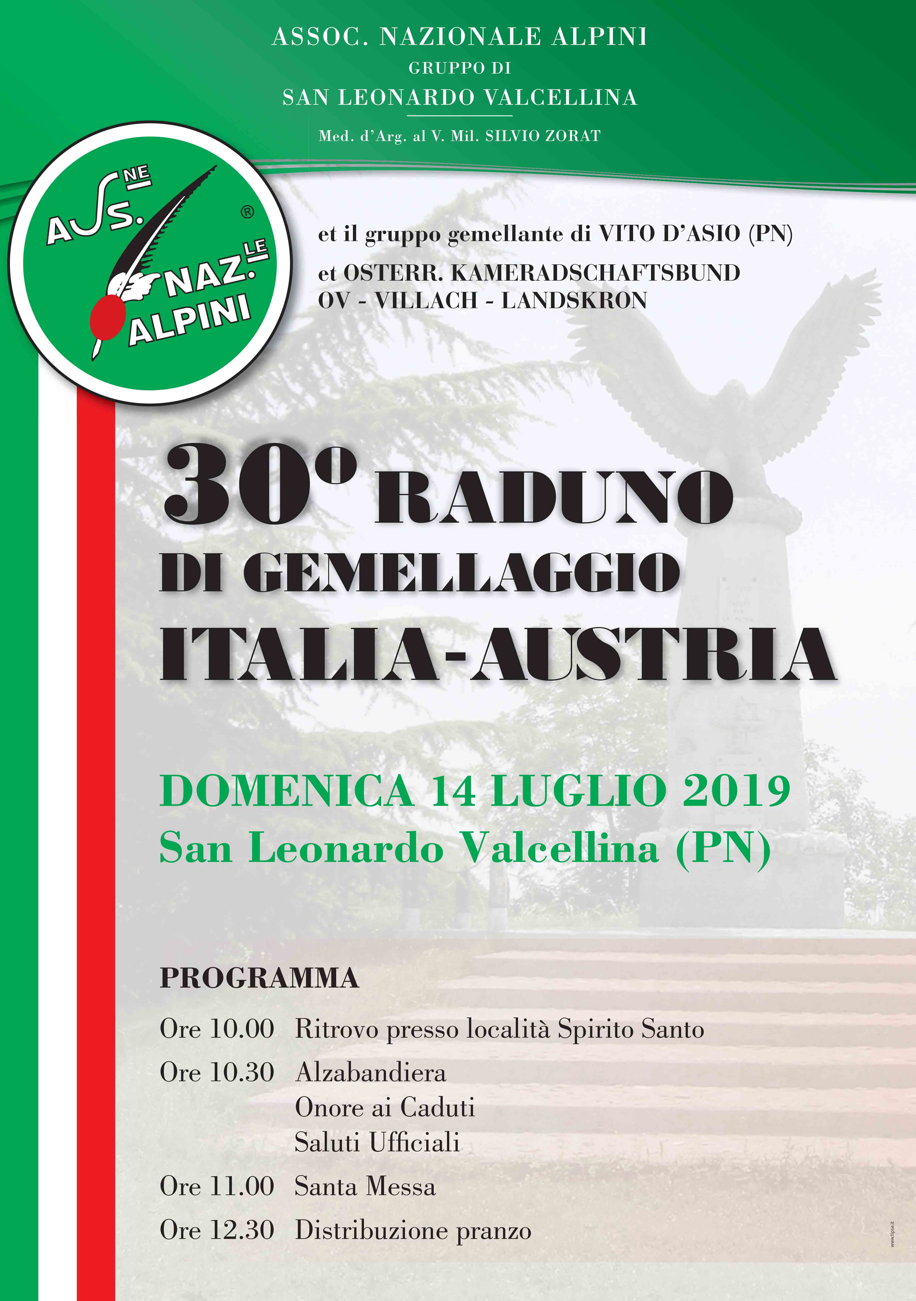 A S.Leonardo ValcellinaPROGRAMMADom 14 lug 2019Ore 10.00 Ritrovo presso località Spirito SantoOre 10.30 Alzabandiera-Onore ai Caduti-Saluti ufficialiOre 11.00 Santa MessaOre 12.30 Distribuzione pranzo.