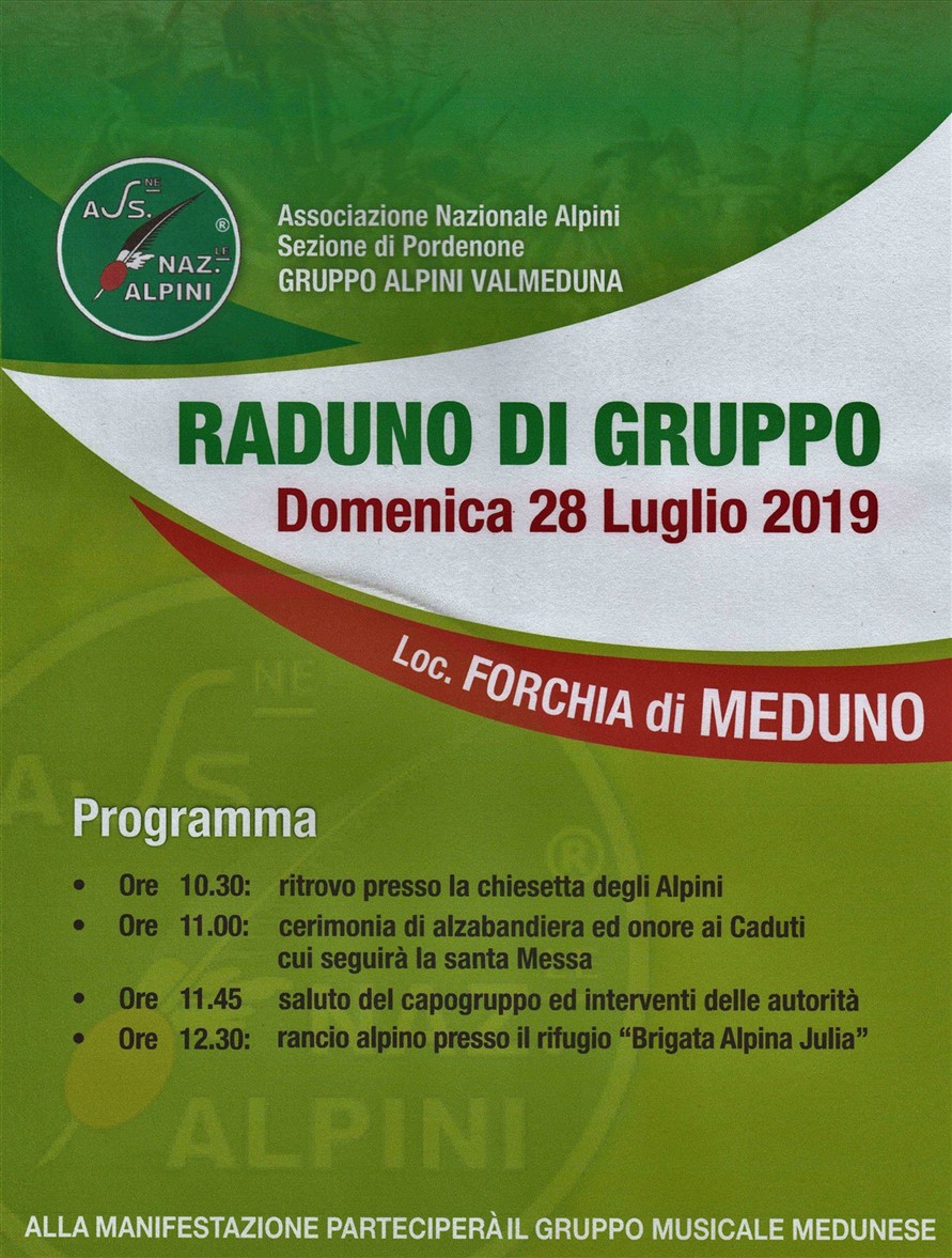 PROGRAMMADom 28 luglio 2019Ore 10.30 Ritrovo presso la chiesetta degli AlpiniOre 11.00 Cerimonia di Alzabandiera ed onore ai caduti Santa MessaOre 11.45 DiscorsiOre 12.30 Rancio alpino presso il Rifuigio "Brigata Alpina Julia"
