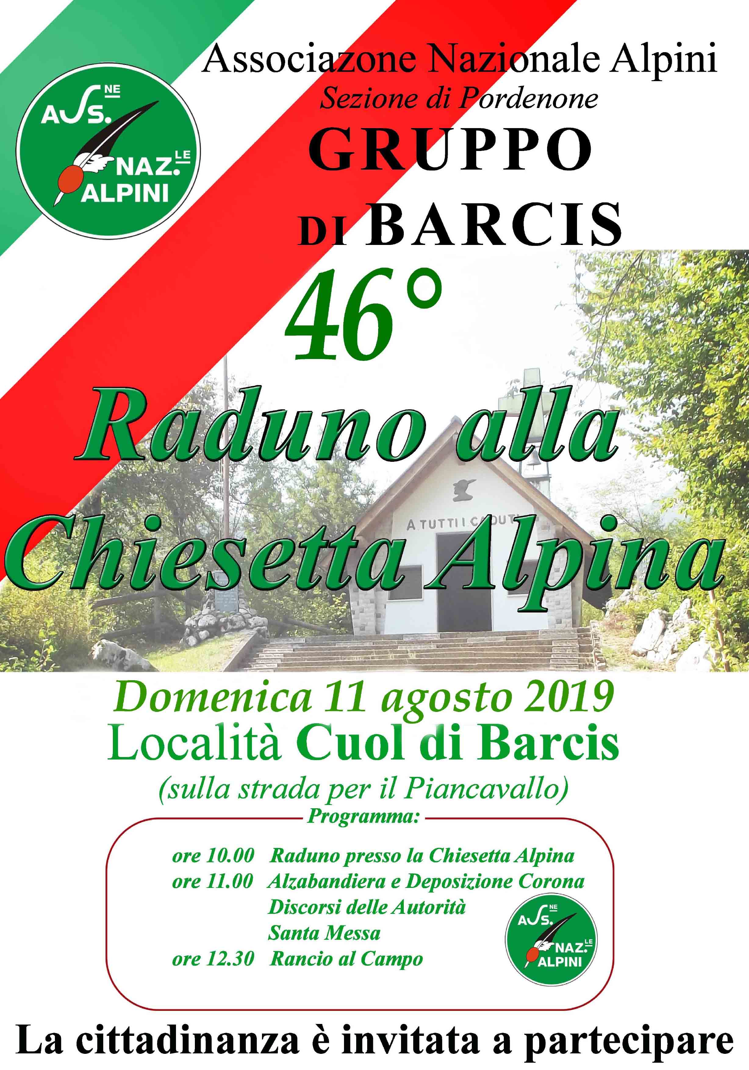 PROGRAMMADom 11 ago 2019ore 10.00 Raduno presso la Chiesetta Alpinaore 11.00 Alzabandiera e deposizione corona Discorsi delle autorità Santa Messaore 12.30 Rancio