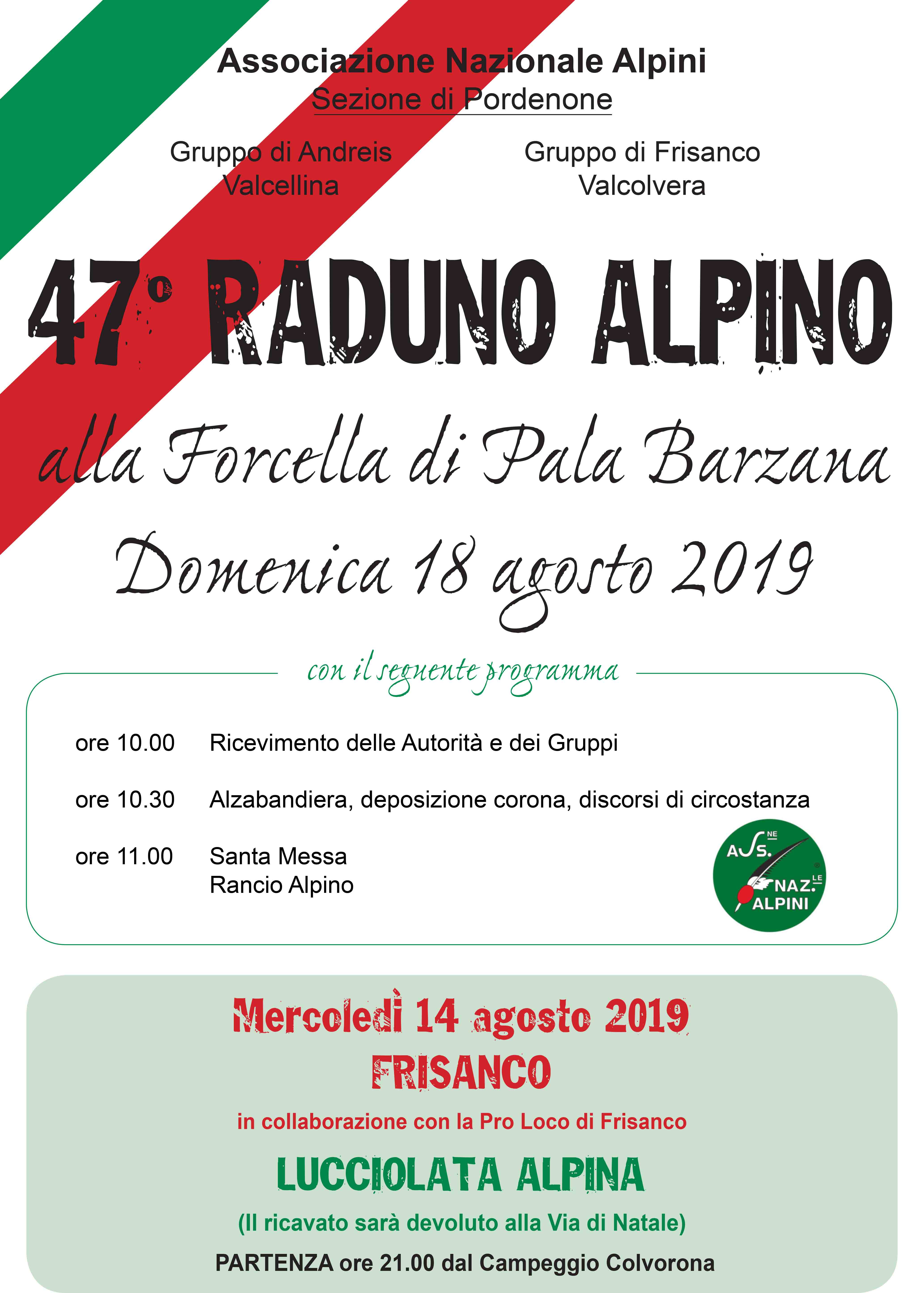 PROGRAMMA:Dom 18 ago 2019ore 10.00 Ricevimento delle autorità e dei Gruppiore 10.30 Alzabandiera, deposizione corona, discorsi ore 11.00 Santa MessaRancio Alpino