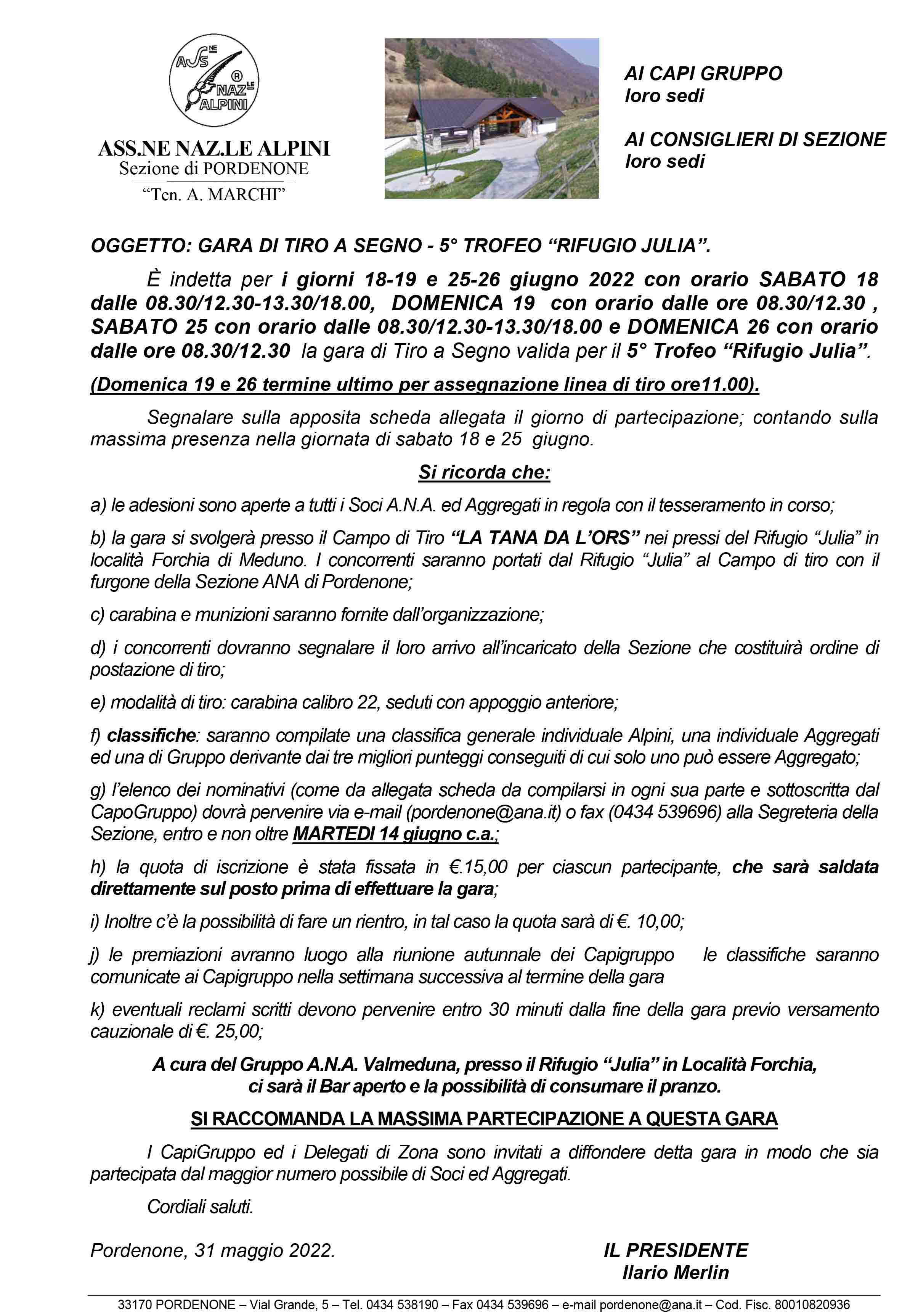 b) la gara si svolgerà presso il Campo di Tiro “LA TANA DA L’ORS” nei pressi del Rifugio “Julia” in località Forchia di Meduno. I concorrenti saranno portati dal Rifugio “Julia” al Campo di tiro con il furgone della Sezione ANA di Pordenone;