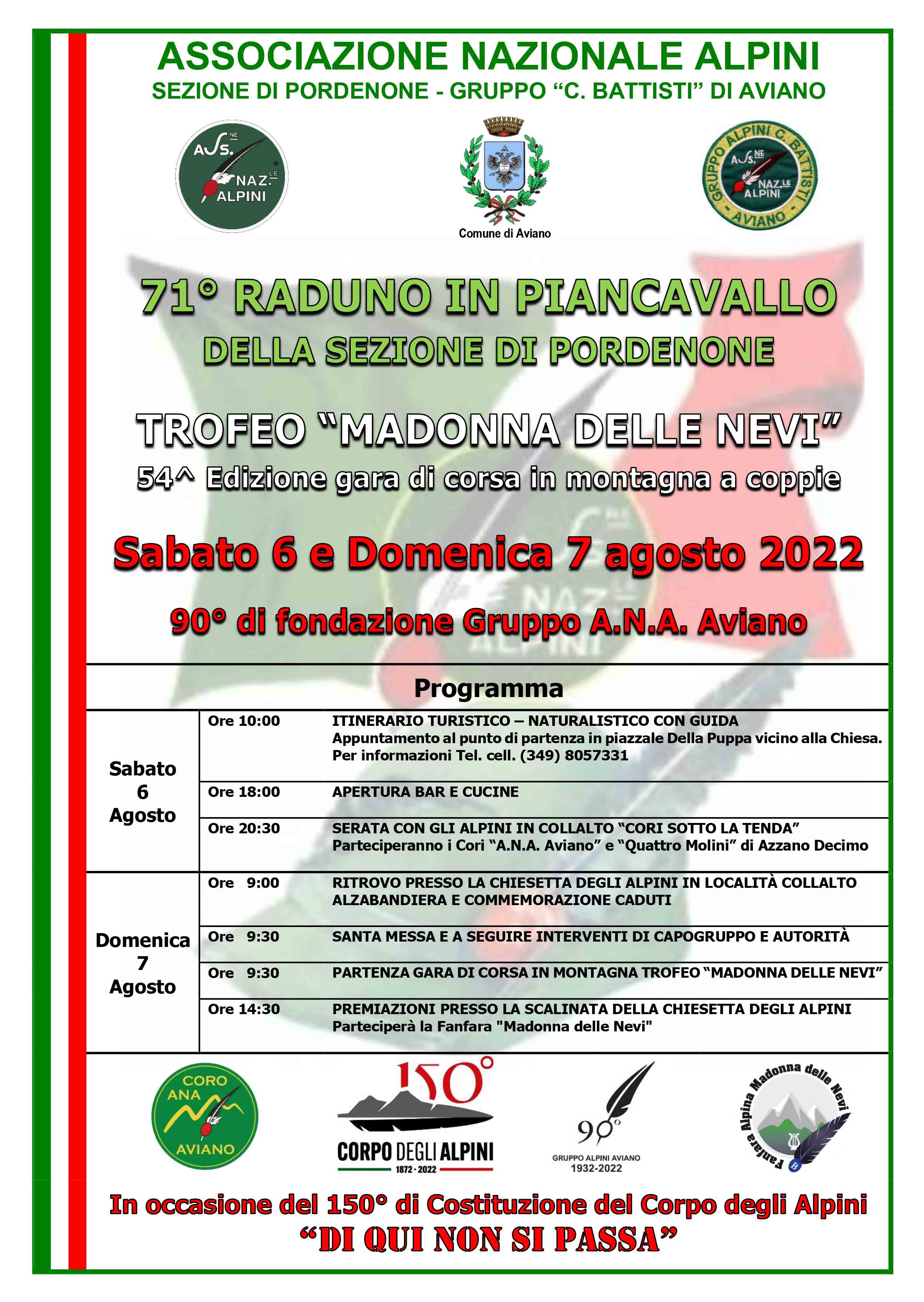 Dom 7 ago 2022Programma:ore 09.00 Ritrovo presso la Chiesetta degli Alpini - Alzabandiera - Commemorazione cadutiore 09.30 Santa Messa - Discorsi autorità(Tutto il programma è documentato sul manifesto)