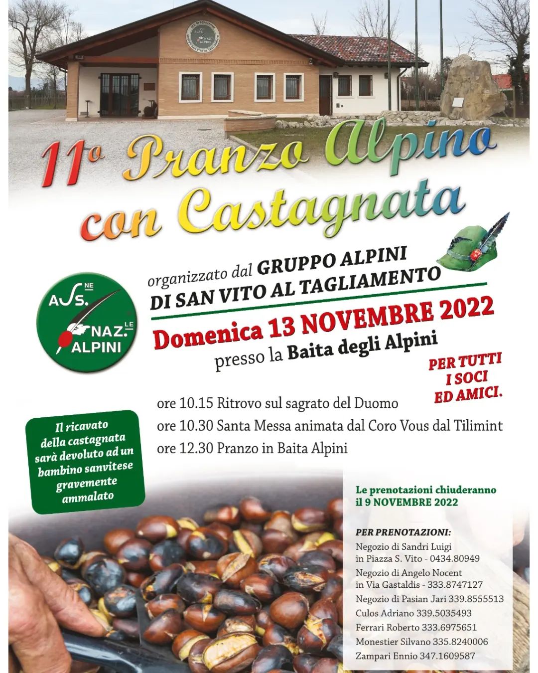 Programmadom 13 nov 2022ore 10.15 Ritrovo sul sagrato del Duomoore 10.30 Santa Messa con il Coro Vous dal Tilimintore 12.30 Pranzo in Baita Alpini