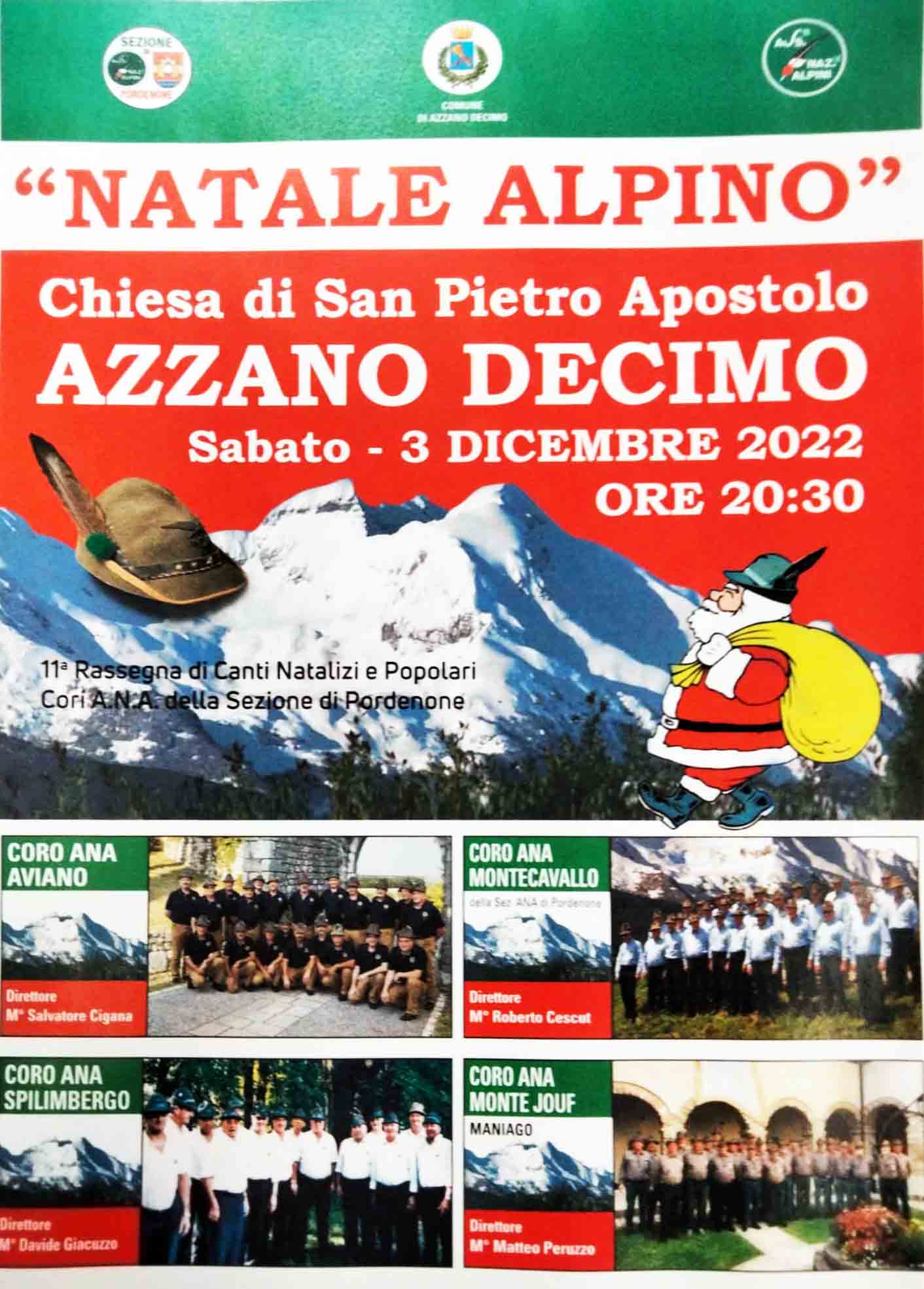 PROGRAMMA:sab 3 dic 2022ore 20,30 Presso la Chiesa di Azzano X°si esibiranno i Cori Sezionali:Coro ANA Aviano (PN)Coro ANA Montecavallo di PN Coro ANA Spilimbergo (PN)Coro ANA Monte Jouf di Maniago (PN)