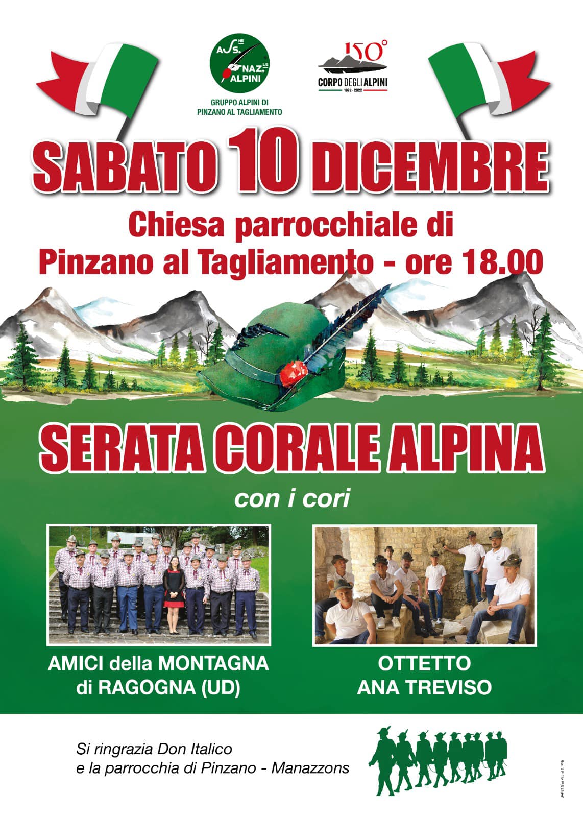PROGRAMMA:sab 10 dic 2022Ore 18.00 Chisa parrocchiale con i Cori:Amici della Montagna di Ragogna e l'Ottetto ANA di Treviso.
