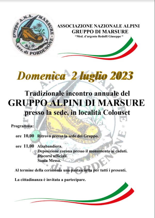 PROGRAMMAdom 2 lug 2023ore 10,00 Ritrovo presso la sede del Gruppoore 11,00 Alzabandiera Deposizione corono presso il Monumento ai Caduti Discorsi ufficiali Santa MessaAl termine della cerimonia una pastasciutta per tutti i presenti