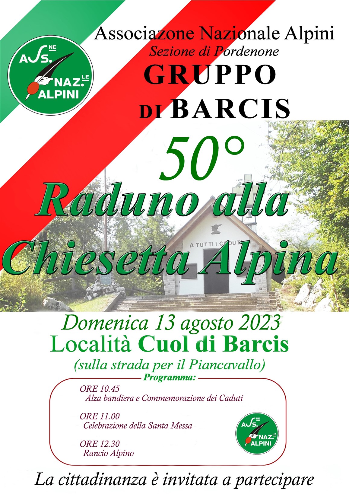 PROGRAMMAdom 13 ago 2023ore 10.45 Alza Bandiera e commemorazione Cadutiore 11.00 Santa Messaore 12.30 Rancio Alpino