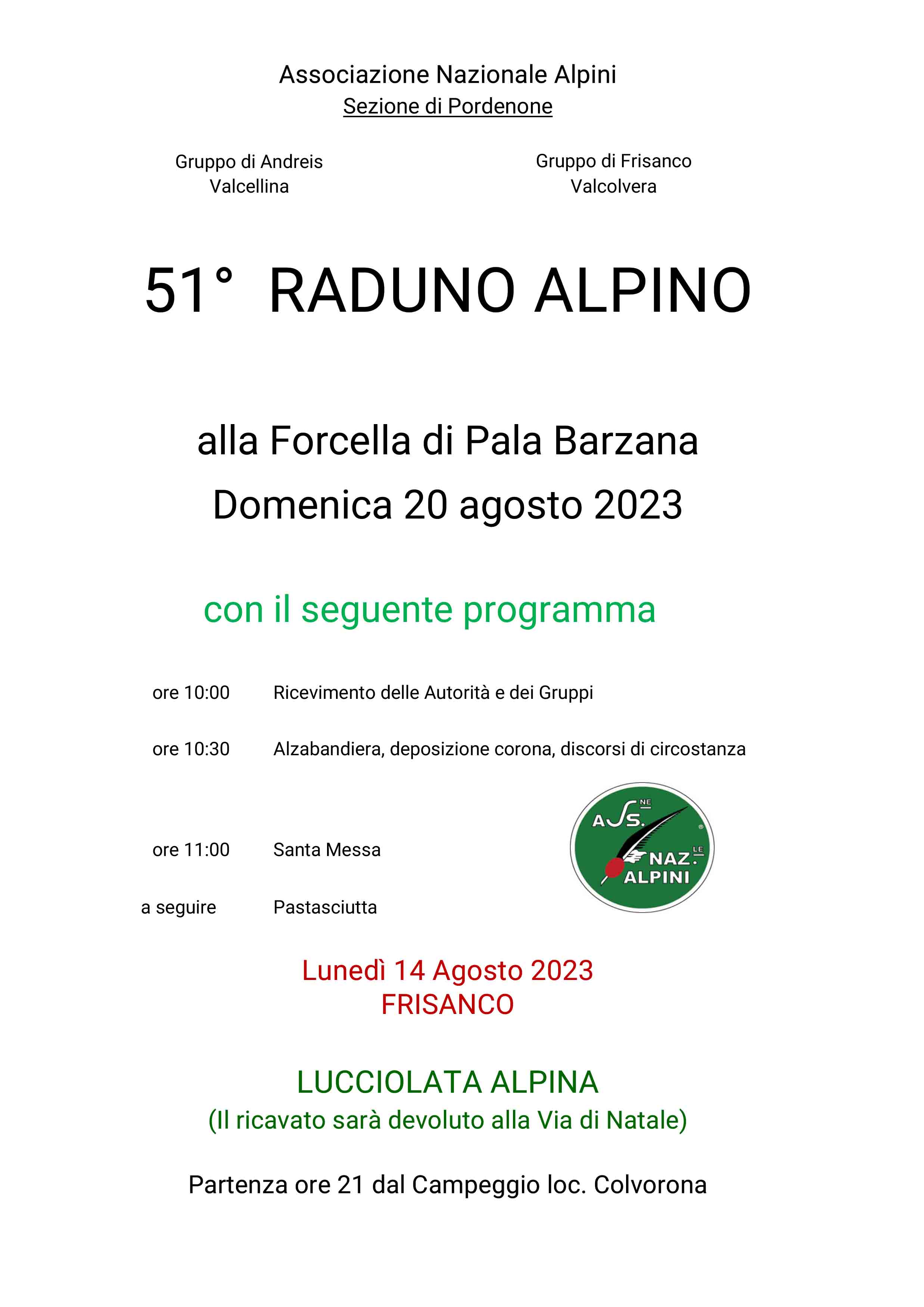 PROGRAMMAdom 20 ago 2023ore 10.00 Ricevimento Autorità e Gruppiore 10.30 Alzabandiera, deposizione corona, discorsiore 11.00 Santa Messaa seguire Pastasciutta
