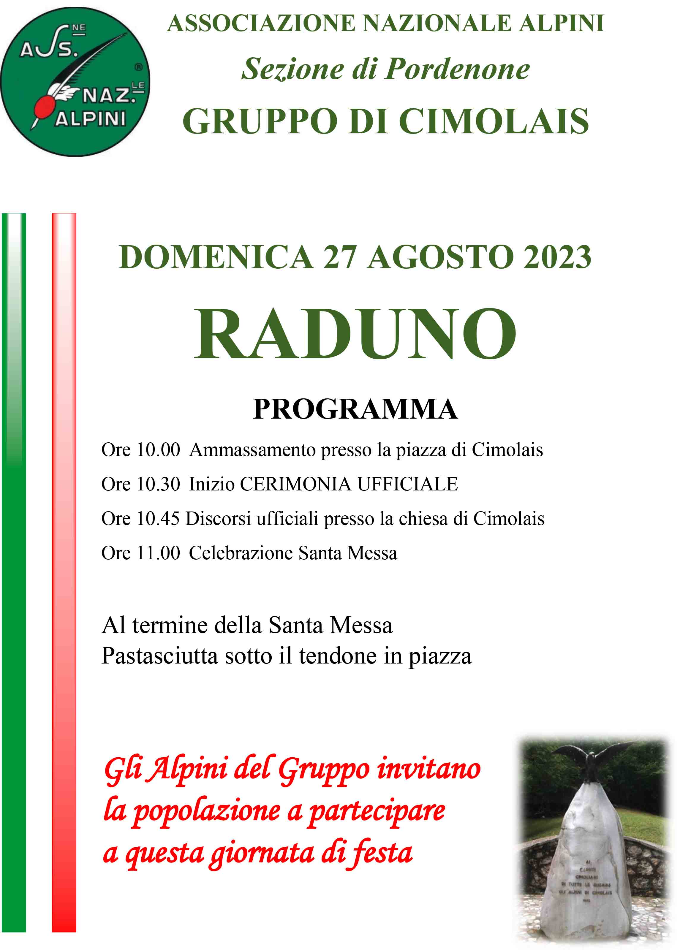 PROGRAMMA dom 27 ago 2023 ore 10.00 Ammassamento presso la piazza di Cimolais ore 10.30 Inizio Cerimonia ufficiale ore 10.45 Discorsi ufficiali presso la chiesa di Cimolais ore 11.00 Santa Messa Al termine della S.Messa Pastaciutta sotto il tendone in piazza.