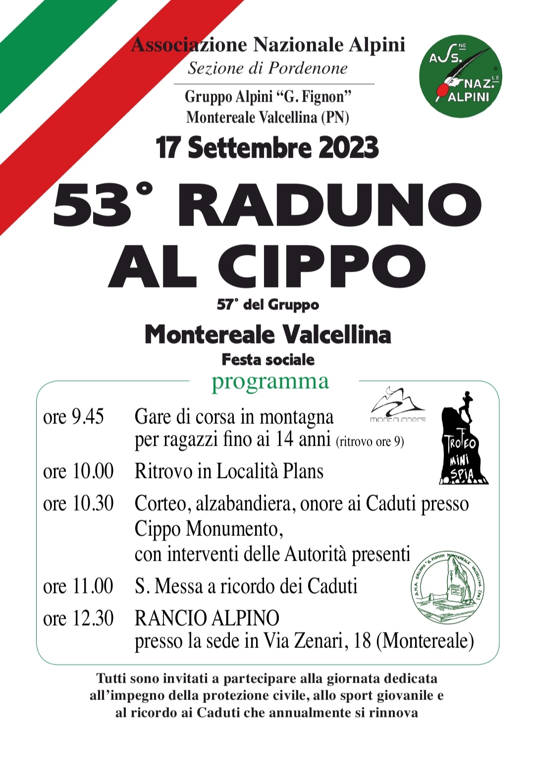 PROGRAMMAdom 17 set 2023ore 10,00 Ritrovo in località Plansore 10.30 Corteo, alzabandiera, onore ai Caduti presso Cippo Monumento - intervento Autoritàore 11.00 S.Messaore 12.30 Rancio alpino presso la sede in via Zennari, 18