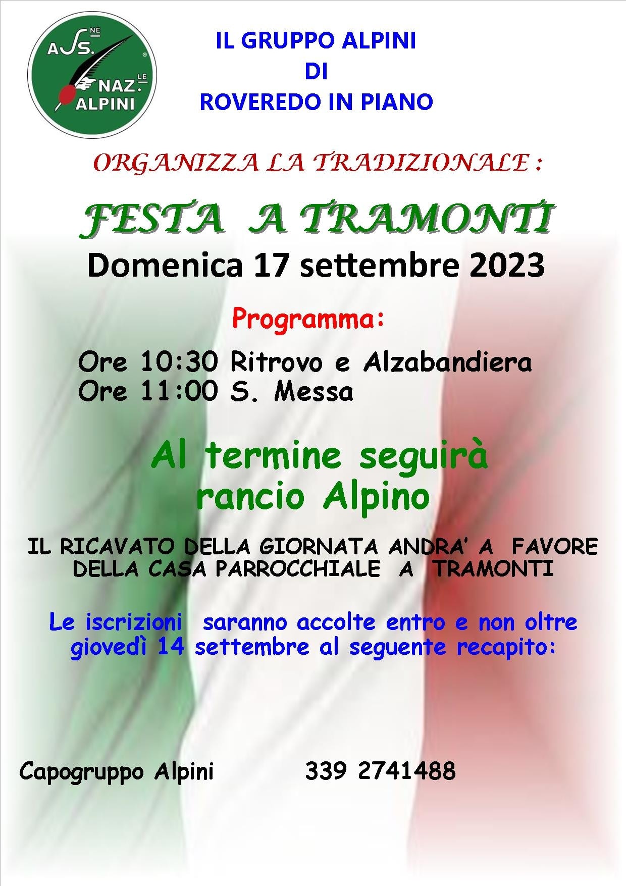 PROGRAMMAdom 17 set 2023ore 10.30 Ritrovo e Alzabandieraore 11.00 S.Messaal termine seguirà rancio Alpino