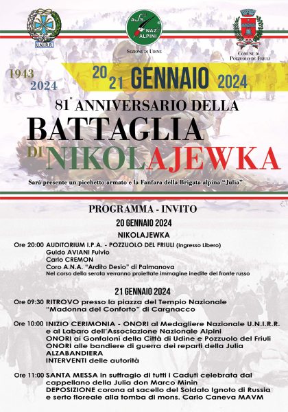 Programma dom 21 gen 2024 ore 09,30 Ritrovo presso la piazza del Tempio ore 10.00 Inizio cerimonia - Onori ai Labari e alle Bandiere - Alzabandiera ore 11.00 Santa Messa - Deposizione corona al sacello del Soldato ignoto di Russia e sulla tomba di Carlo Caneva