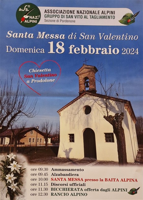 PROGRAMMAdom 18 feb 2024ore 09.30 Ammassamentoore 09.45 Alzabandieraore 10.00 S.Messa presso la Baitaore 11.15 Discorsi ufficialiore 11.30 Bicchierataore 12.30 Rancio Alpino