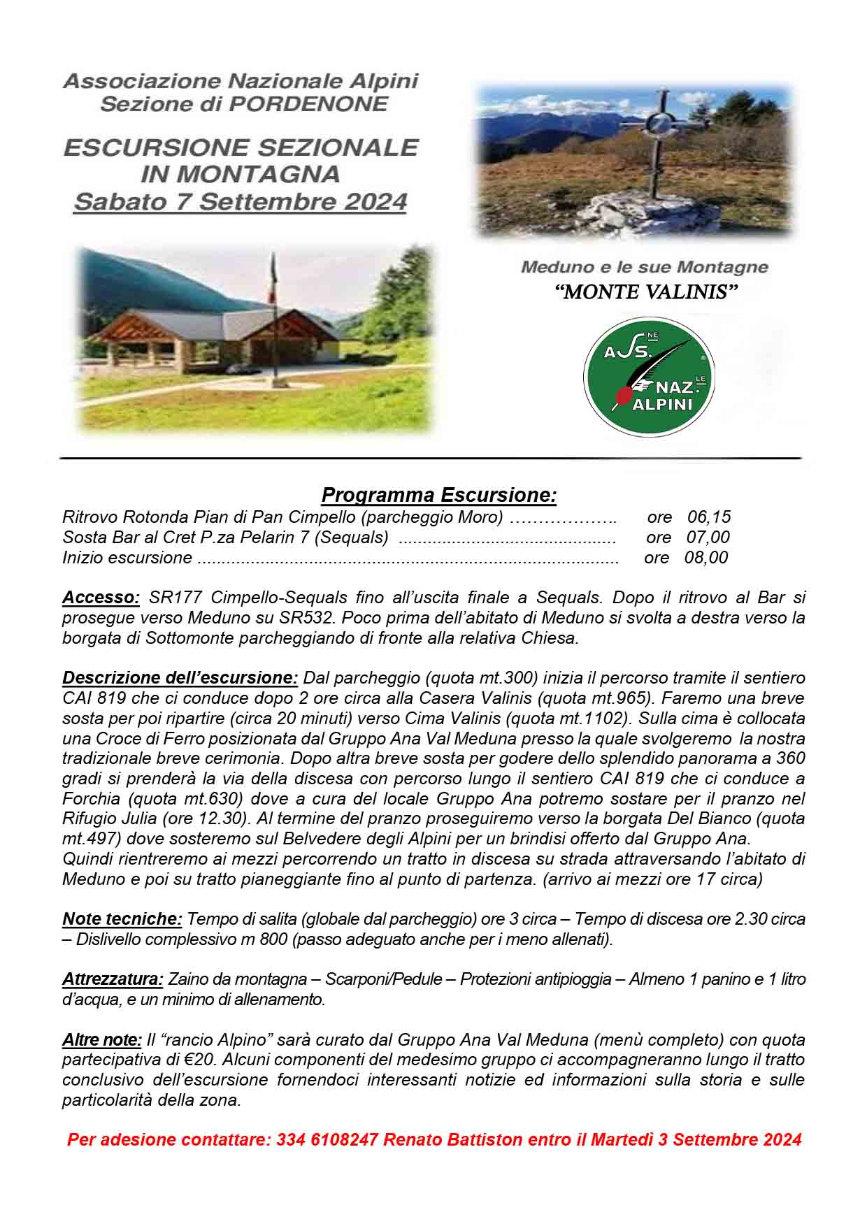 Per adesione contattare: 334 6108247 Renato Battiston entro il Martedì 3 Settembre 2024