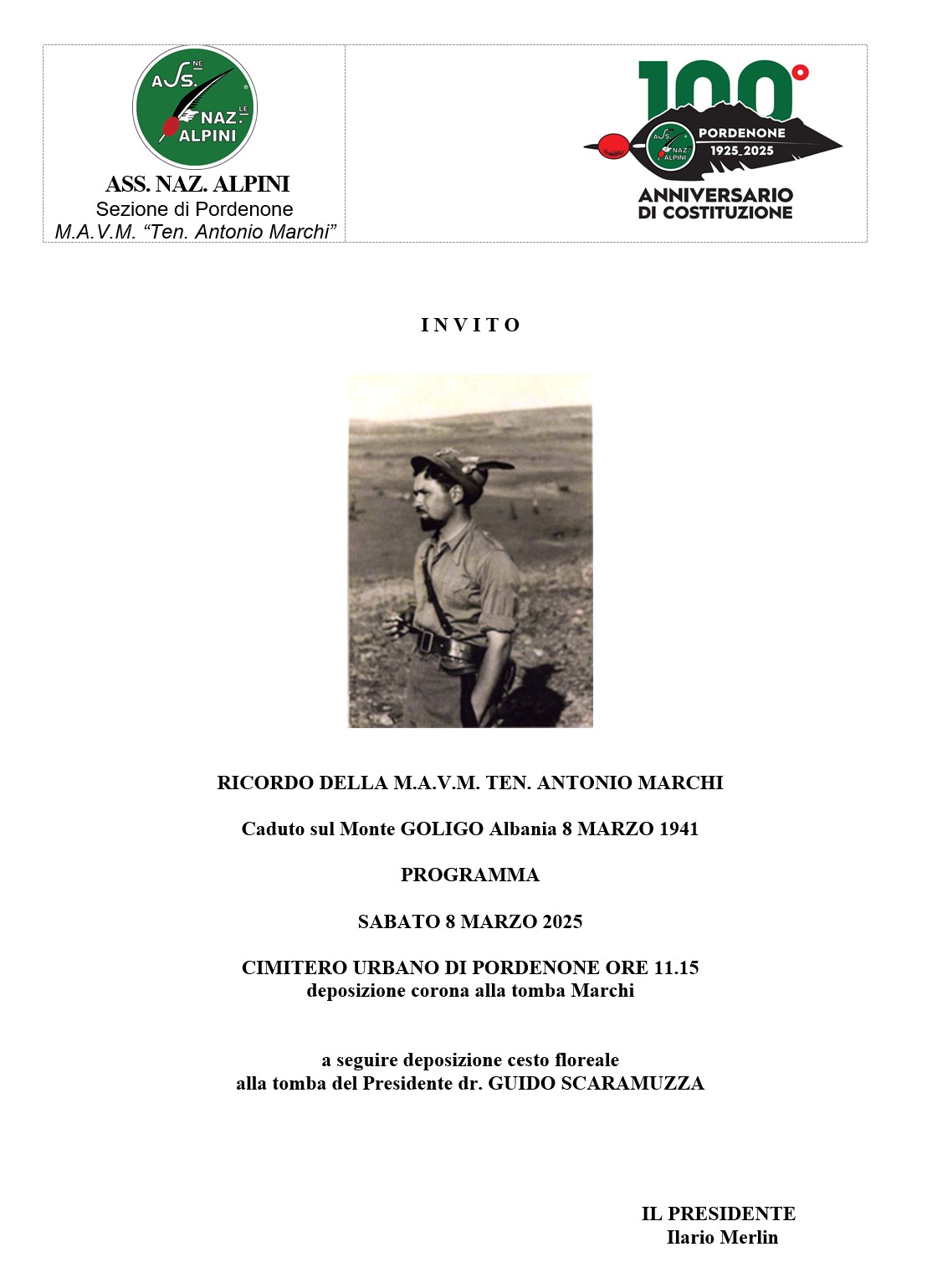 PORDENONE - CIMITERO URBANO RICORDO DELLA M.A.V.M. TEN. ANTONIO MARCHI Caduto sul Monte Golico - 8 marzo 1941 sab 08 mar 2025 ore 11.15 Deposizione corona alla tomba Marchi a seguire deposizione cesto floreale alla tomba del Presidente dr. Guido Scaramuzza