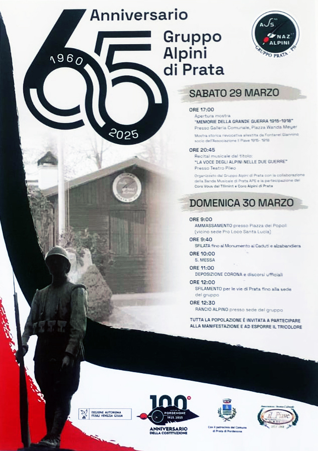 ore 20.45 Recital musicale: "la voce degli Alpini nelle due guerre" - Presso il teatro comunale. Con la Banda musicale di Prata e il Coro "Vous da Tilimint" e Coro Alpini di Prata.