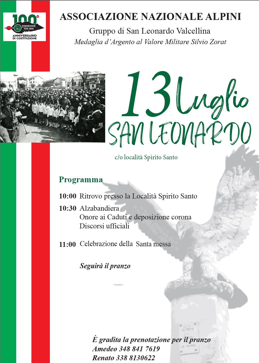 PROGRAMMAdom 13 lug 2025ore 10.00 Ritrovo presso la località Santo Spiritoore 10.30 Alzabandiera Onore ai Caduti e deposizione corona Discorsi ufficialiore 11.00 Santa MessaSeguirà il pranzo