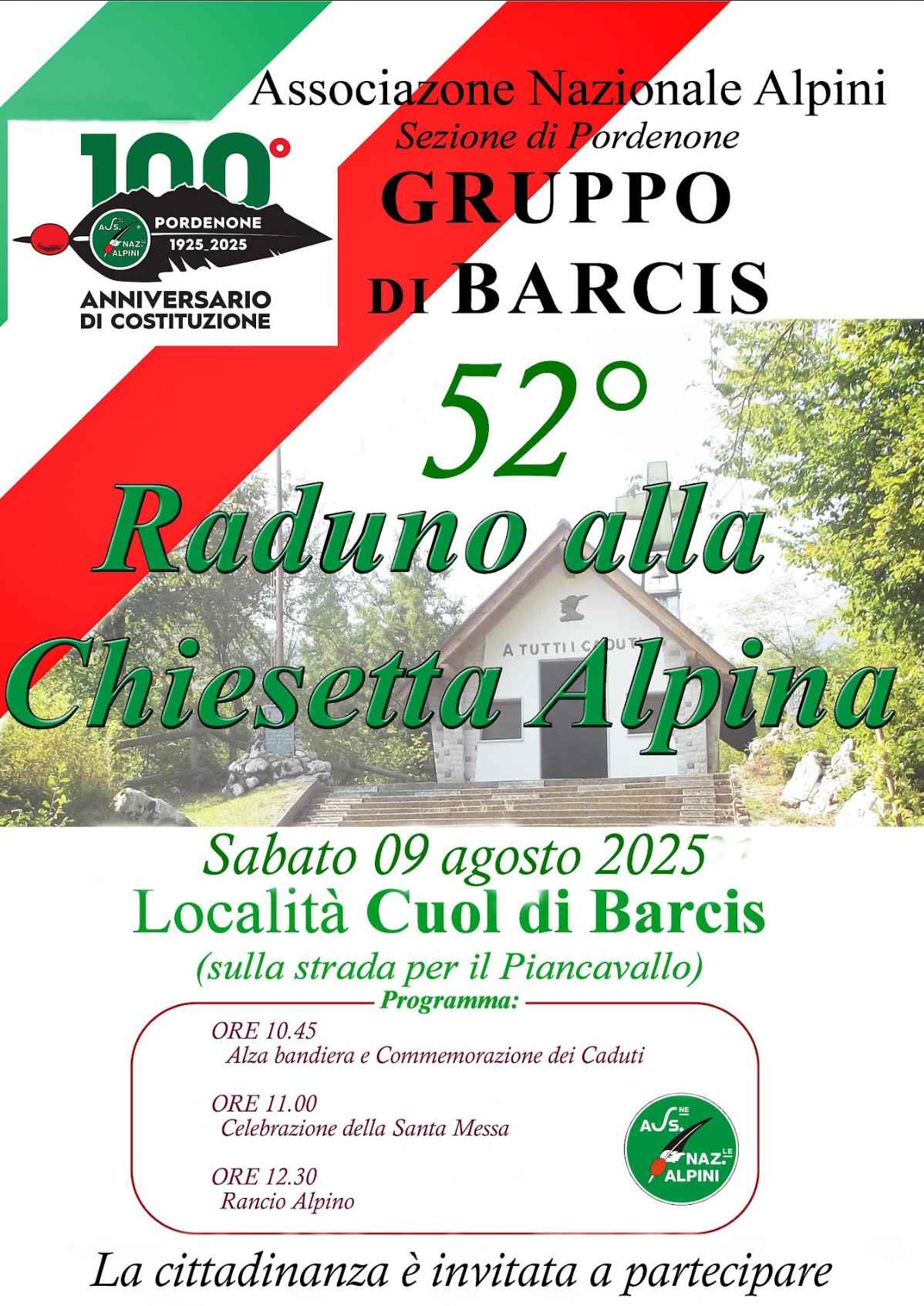 PROGRAMMAsab 9 ago 2025ore 10.45 Alzabandiera e Commemorazione dei Cadutiore 11.00 Santa Messaore 12.30 Rancio