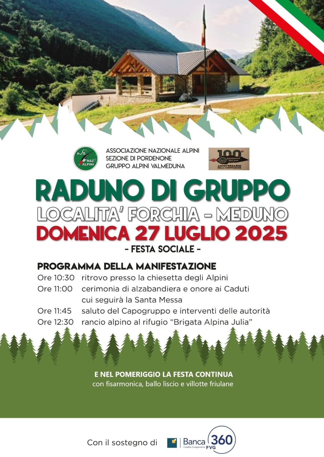 PROGRAMMAdom 27 lug 2025ore 10.30 Ritrovo presso la chiesetta degli Alpiniore 11.00 Alzabandiera e Onore ai caduti Santa Messaore 11.45 Intervento autoritàore 12.30 Rancio alpino al rifugio "Brigata Alpina Julia"