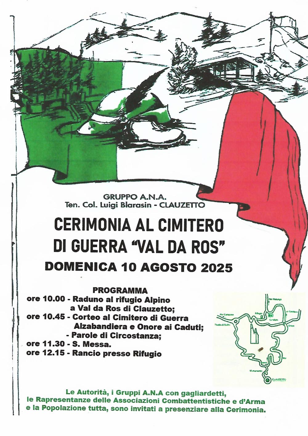PROGRAMMAdom 10 ago 2025ore 10.00 Raduno al rifugio Alpino a Val da Ros di Clauzettoore 10.45 Corteo al Cimitero di Guerra - Alzabandiera e Onore ai Caduti Alzabandiera e Onore ai Cadutiore 11.30 S.Messaore 12.15 Rancio presso il Rifugio