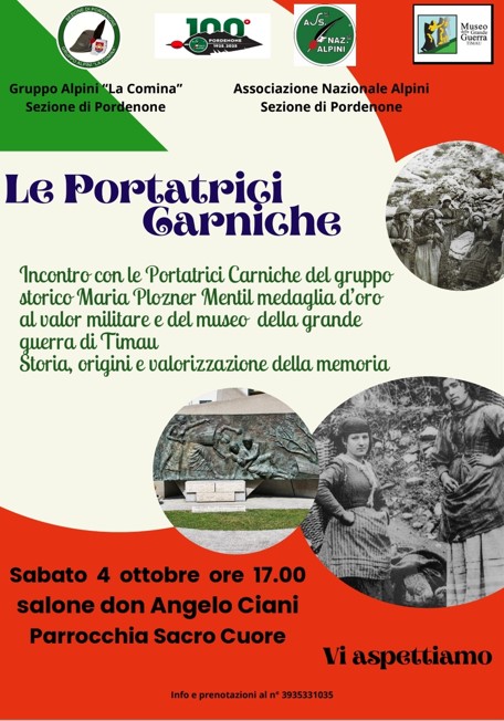 PROGRAMMA sab 04 ott 2025 ore 17.00 Salone don Angelo Ciani - Incontro con le Portatrici carniche del Gruppo storico Maria Plozner Mentil medaglia d'oro al valor militare e del museo della grande guerra di Timau. Storia, origini e valorizzazione della memoria.