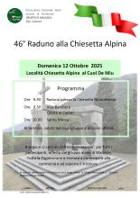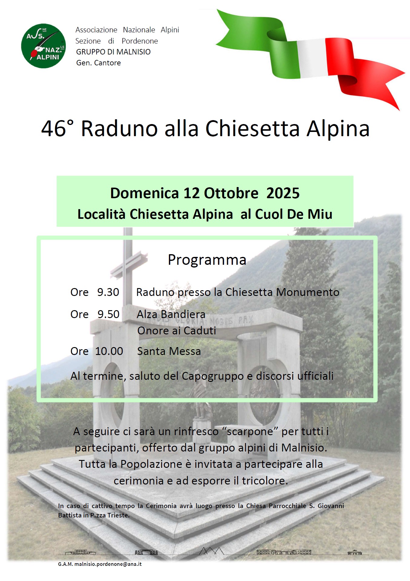 PROGRAMMAdom 12 ott 2025ore 09.30 Raduno presso la Chiesetta Monumentoore 09.50 Alzabandiera - Onore ai Cadutiore 10.00 Santa MessaAl termine, saluto del Capogruppo e discorsi ufficialiA seguire rinfresco