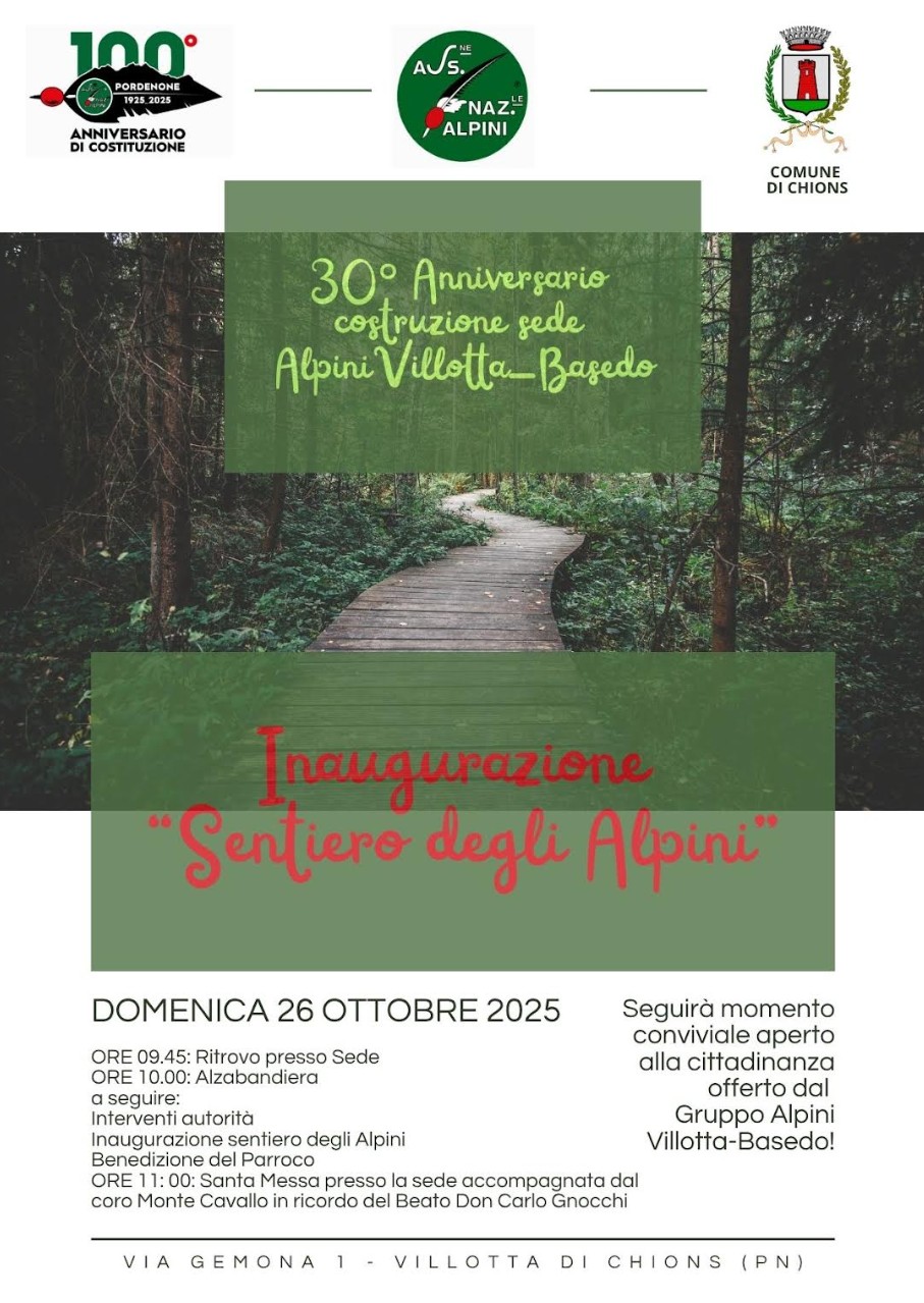 PROGRAMMAdom 26 ott 2025ore 09.45 Ritrovo presso Sedeore 10.00 Alzabandiera a seguire:Inaugurazione sentiero degli AlpiniBenedizione del Parrocoore 11.00 S.Messa presso la sede con il Coro Monte CavalloSeguirà momento conviviale