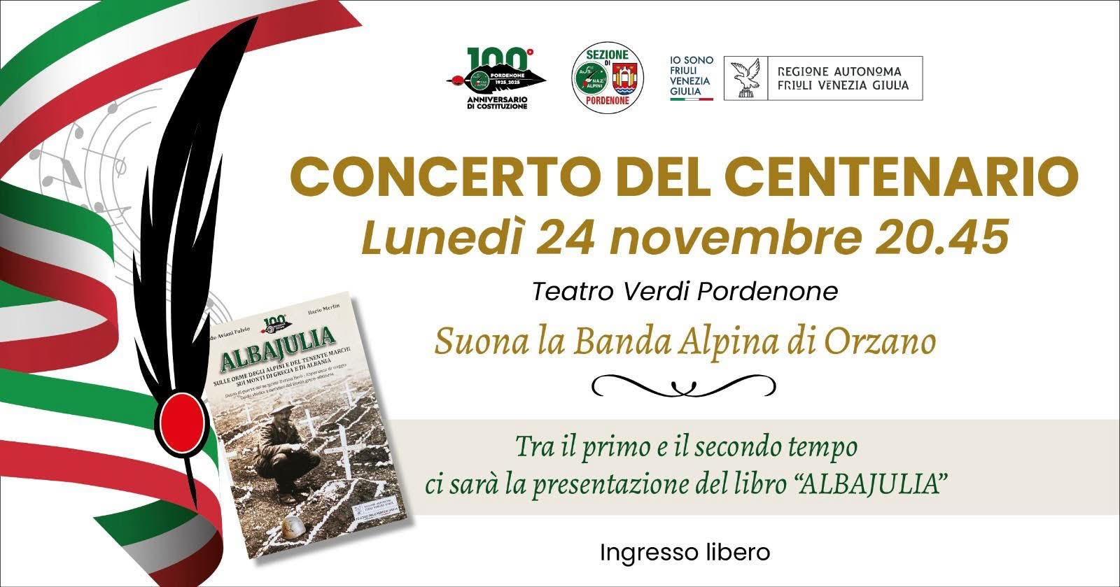 TEATRO VERDI DI PORDENONECONCERTO DEL CENTENARIOlun 24 nov 2025 ore 20,45Suona la Banda Alpina di Orzano----------------------------Tra il primo e secondo tempo ci saràla presentazione del libro "ALBAJULIA"