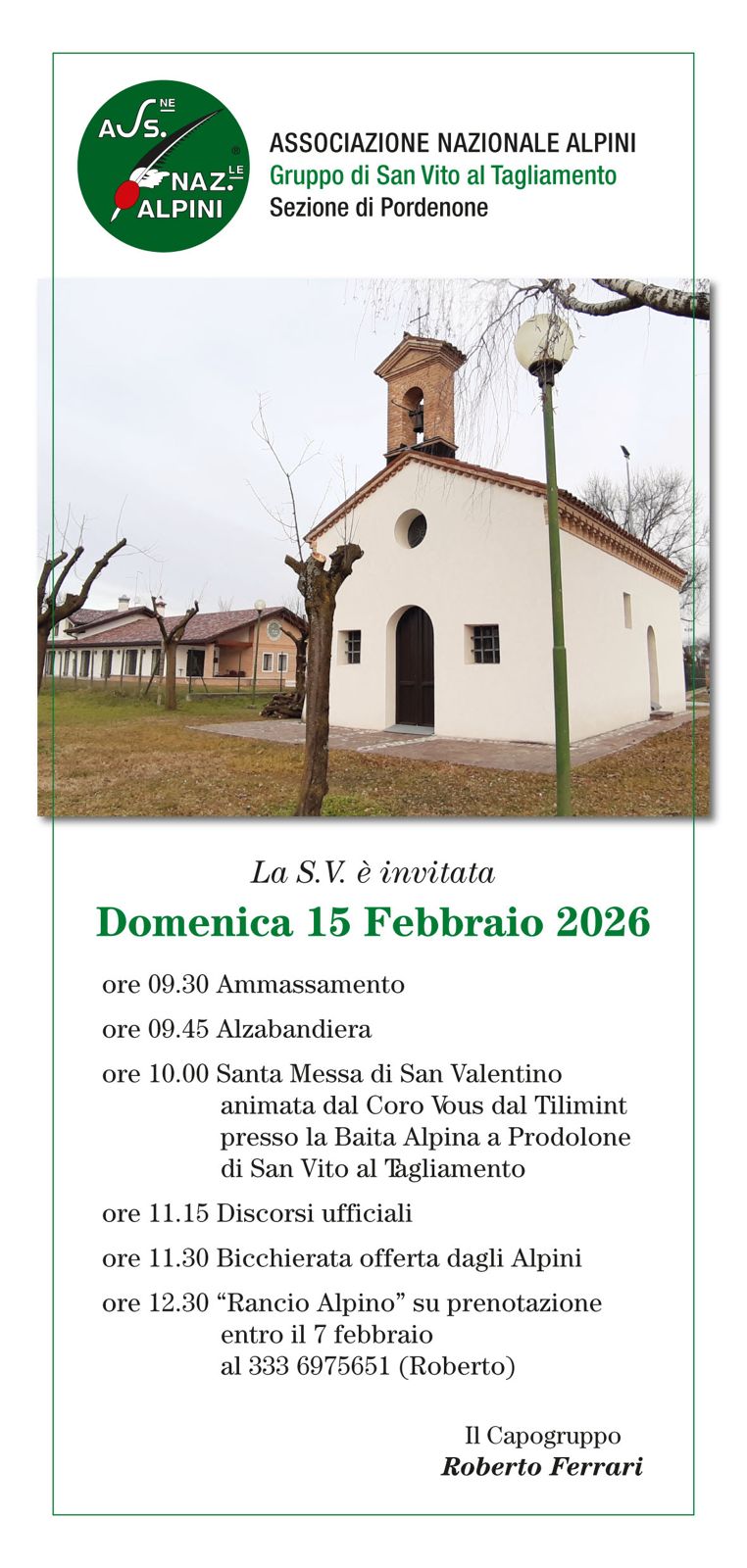 PROGRAMMAdom 15 feb 2026ore 09.30 Ammassamentoore 09.45 Alzabandieraore 10.00 S.Messa di S.Valentino presso la Baita Alpina animata dal Coro Vous dal Tilimintore 11.15 Discorsi ufficialiore 11.30 Bicchierataore 12.30 "Rancio Alpino"