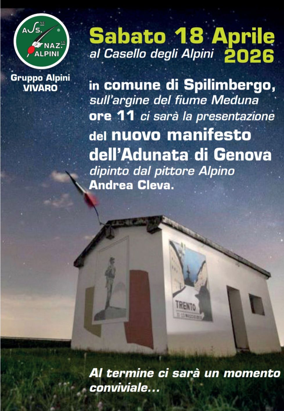 PROGRAMMA sab 18 apr 2026 Ore 11.00 Presentazione del nuovo manifesto dell'Adunata di Genova dipinto dal pittore Alpino Andrea Cleva. Al termine ci sarà un momento conviviale.