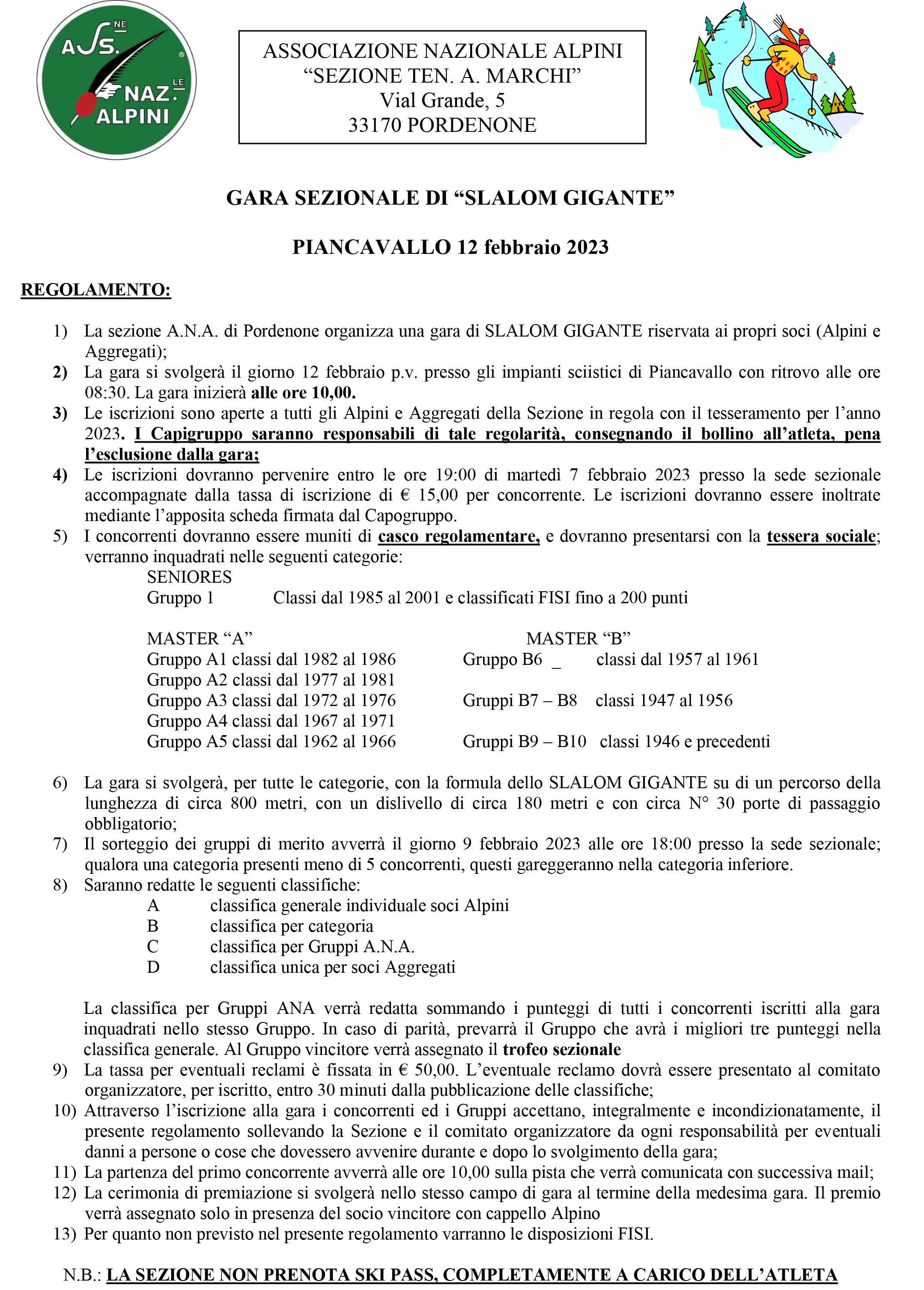 1) La sezione A.N.A. di Pordenone organizza una gara di SLALOM GIGANTE riservata ai propri soci (Alpini e Aggregati);