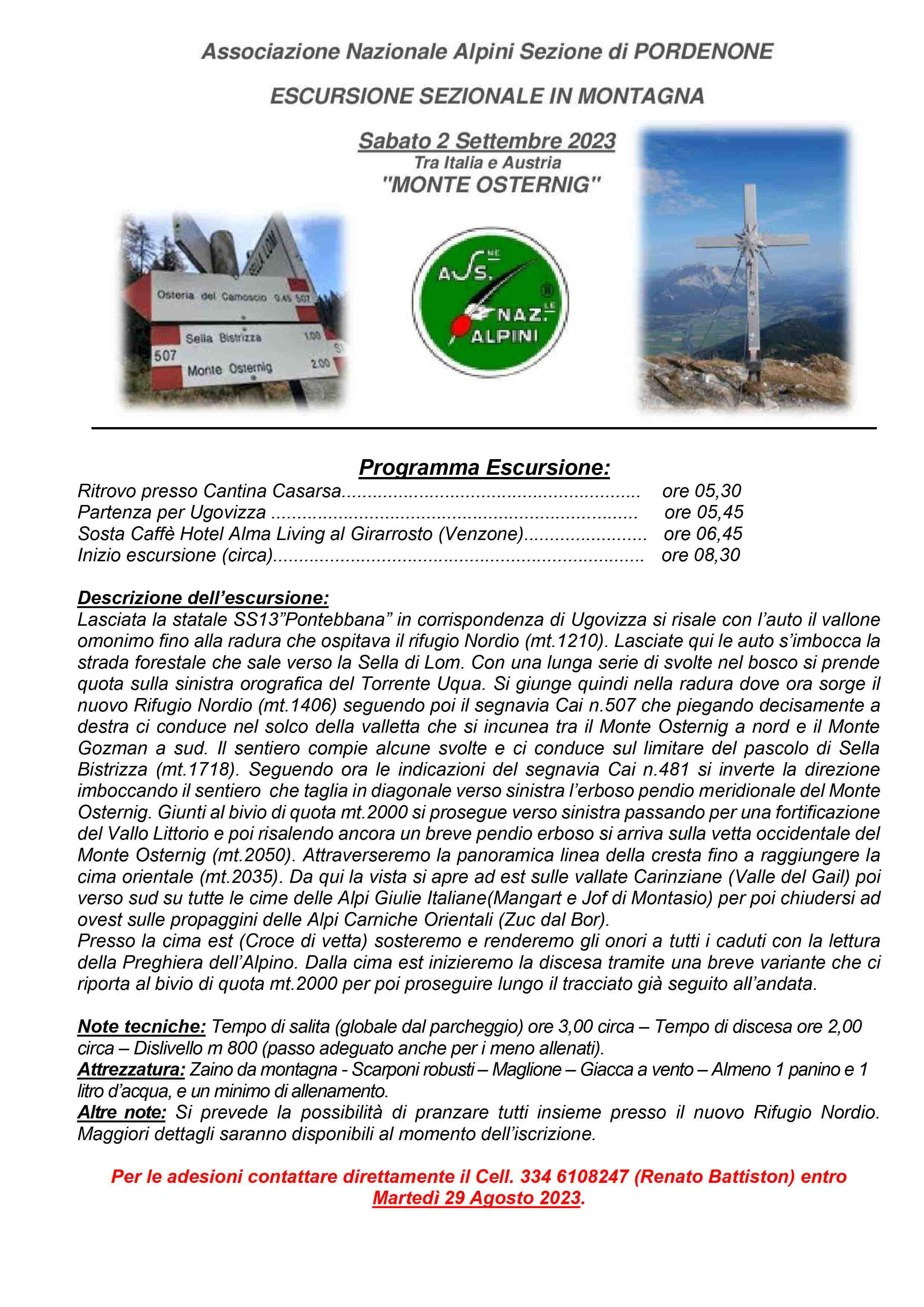 Per le adesioni contattare direttamente il Cell. 334 6108247 (Renato Battiston) entro Martedì 29 Agosto 2023.